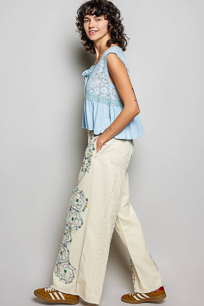 Artistic, feminine, and effortlessly standout — the Floral Patchwork Wide-Leg Pants are a true boutique statement piece. Designed with a soft neutral base and contrasting floral fabric panels, these pants blend texture, embroidery-inspired detailing, and modern silhouette into one unforgettable look.