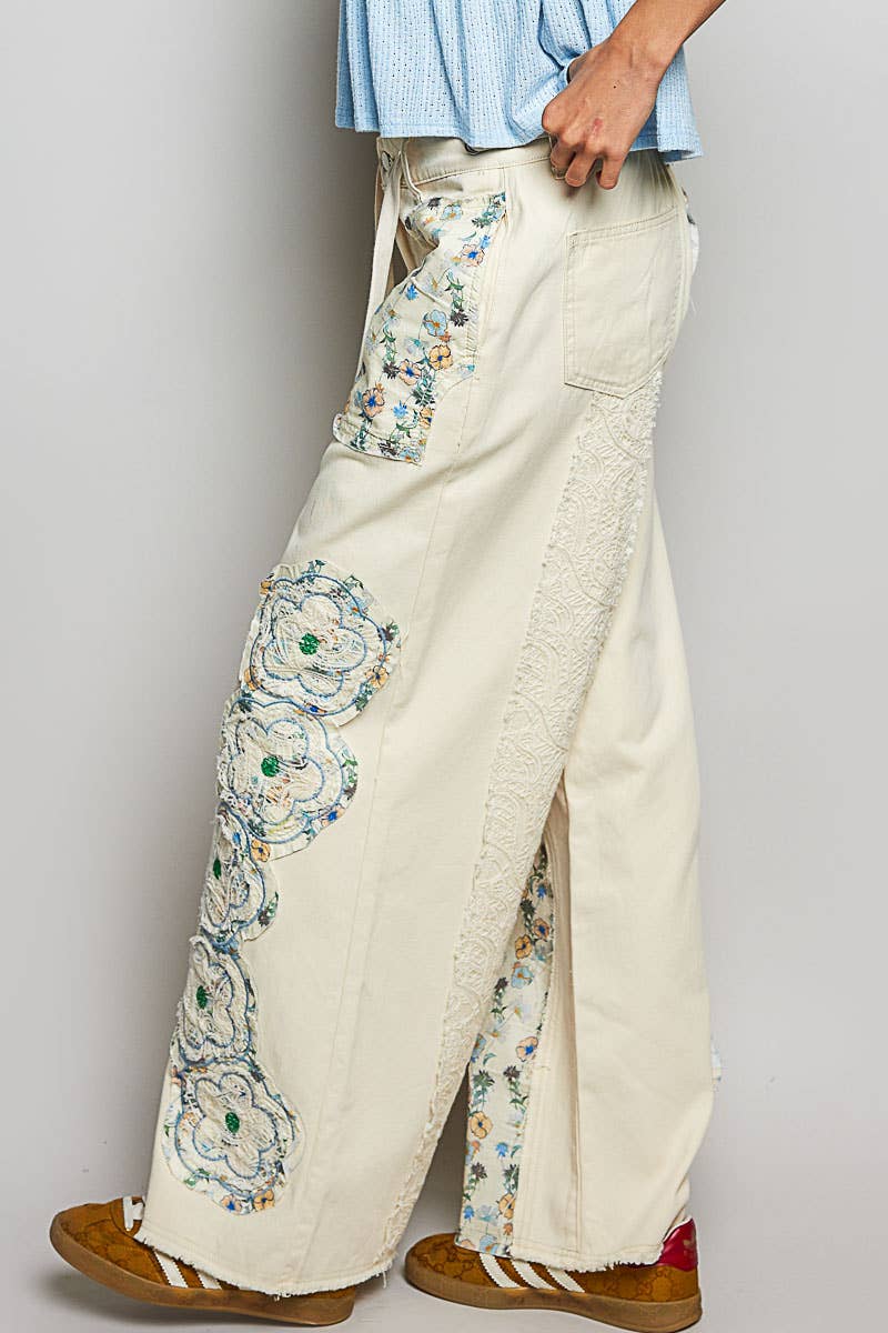The wide-leg cut creates graceful movement, while the mixed-media patchwork adds depth and handcrafted charm. A functional drawstring waistband and structured construction balance comfort with style, making these perfect for elevated everyday wear.