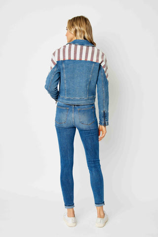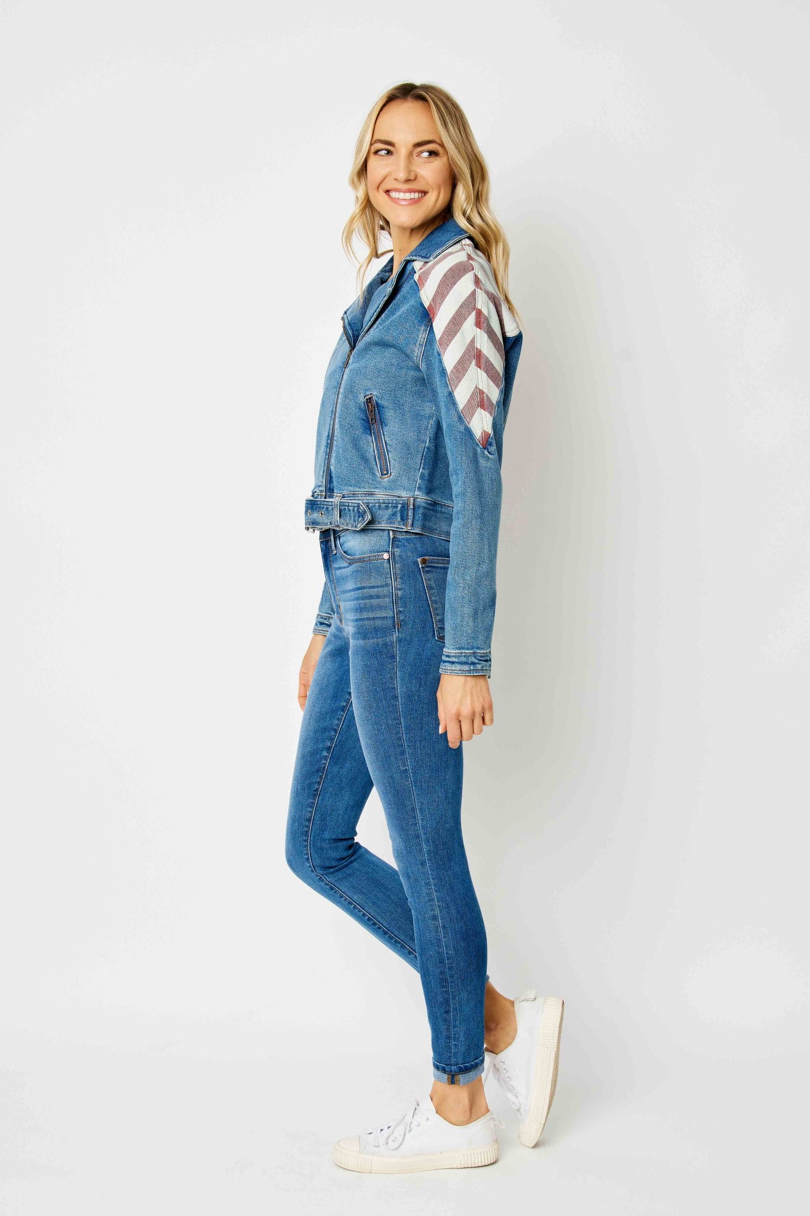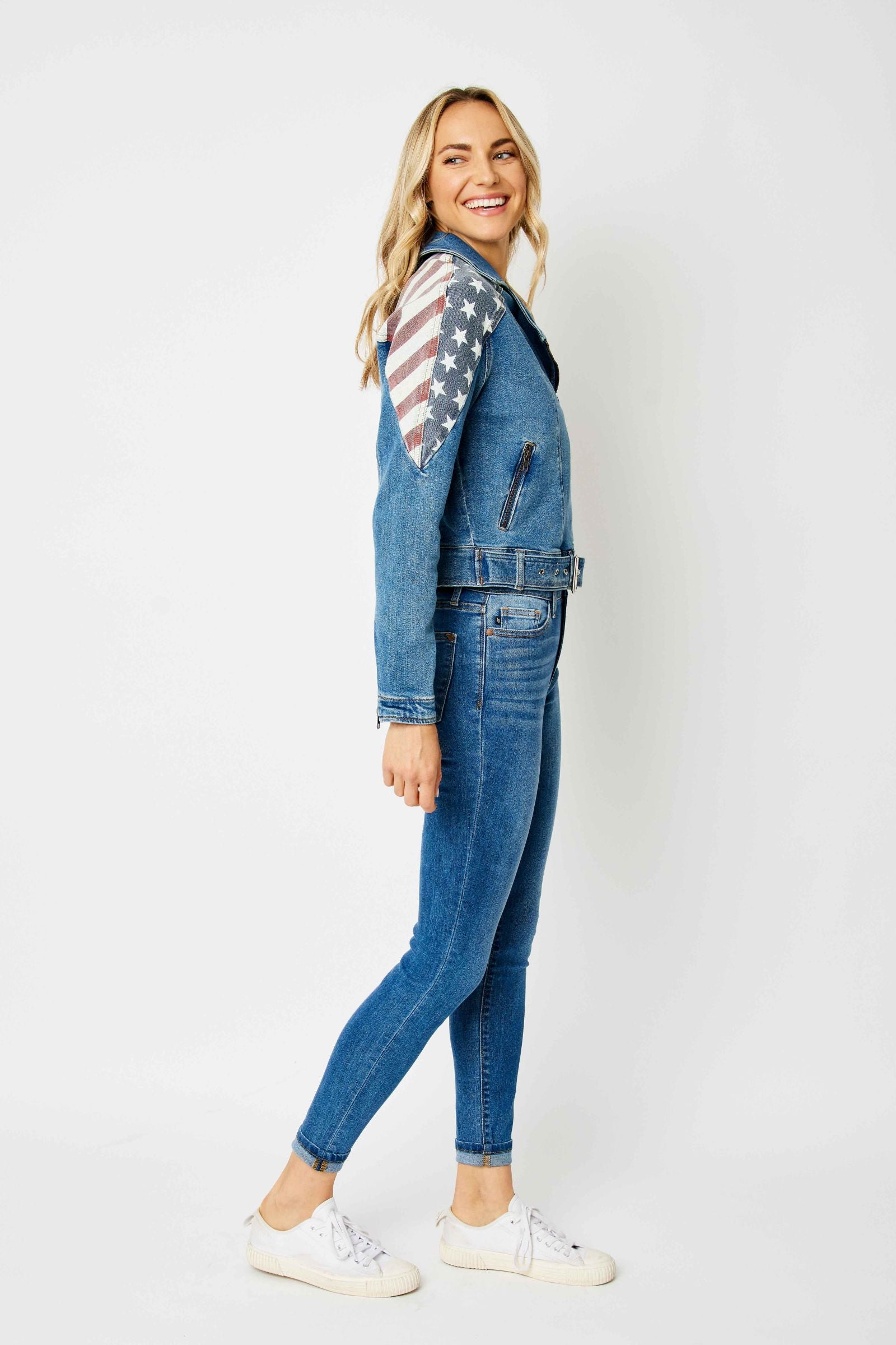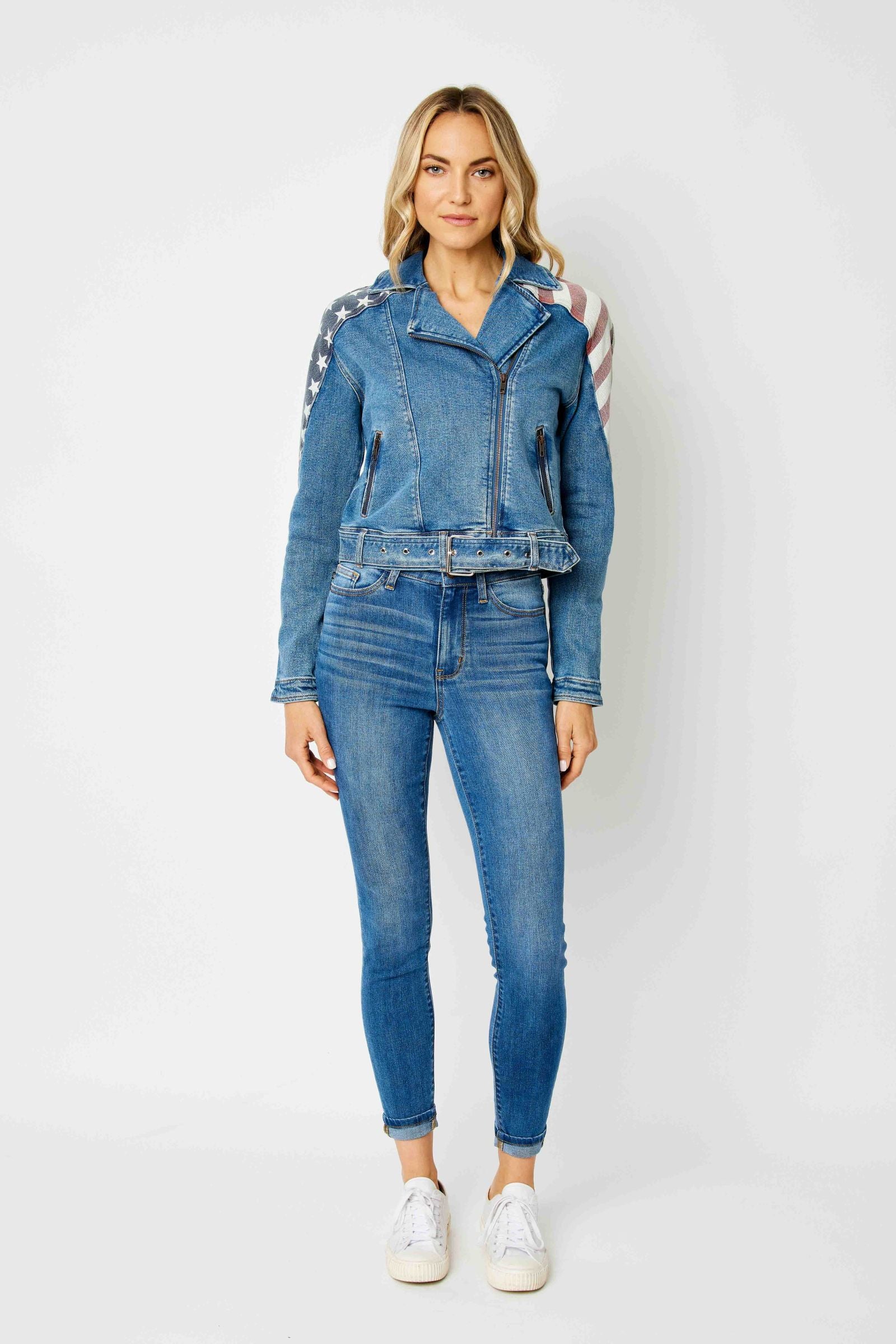 Our Judy Blue Rhinestone Embellished Jacket is crafted from a blend of cotton, poly, rayon, and spandex, allowing for both comfort and style. Its rhinestone embellishments add a touch of glamour to any outfit. With a length of 20.5", it is the perfect addition to your wardrobe.