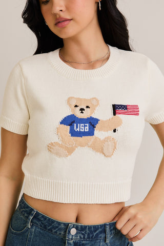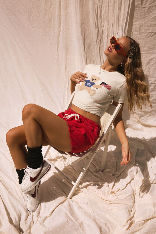 Snuggle up in patriotic style with this adorable teddy bear USA flag graphic cropped sweater from Le Lis! Perfect for casual outings or cozy days at home, this playful piece adds a touch of Americana charm to your wardrobe. The cropped length pairs perfectly with high-waisted bottoms for a trendy, fun look that's sure to turn heads!