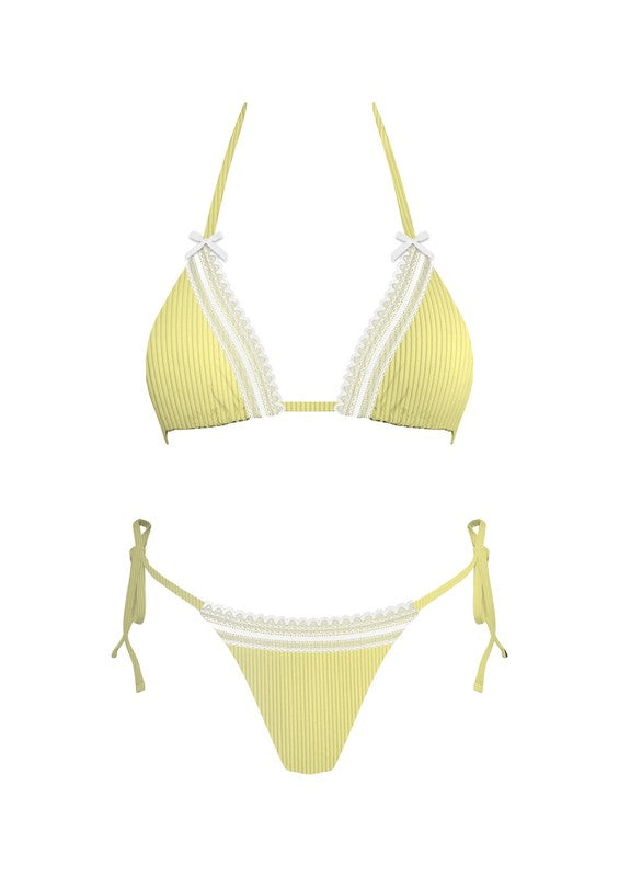 Indulge in a little love story with our Yellow Lace Bikini. Delicate lace trim meets dainty white bows to add a touch of elegance. Made with soft ribbed fabric, these bottoms offer comfortable support. Don't forget to grab the matching short bottoms for a complete look (sold separately)!