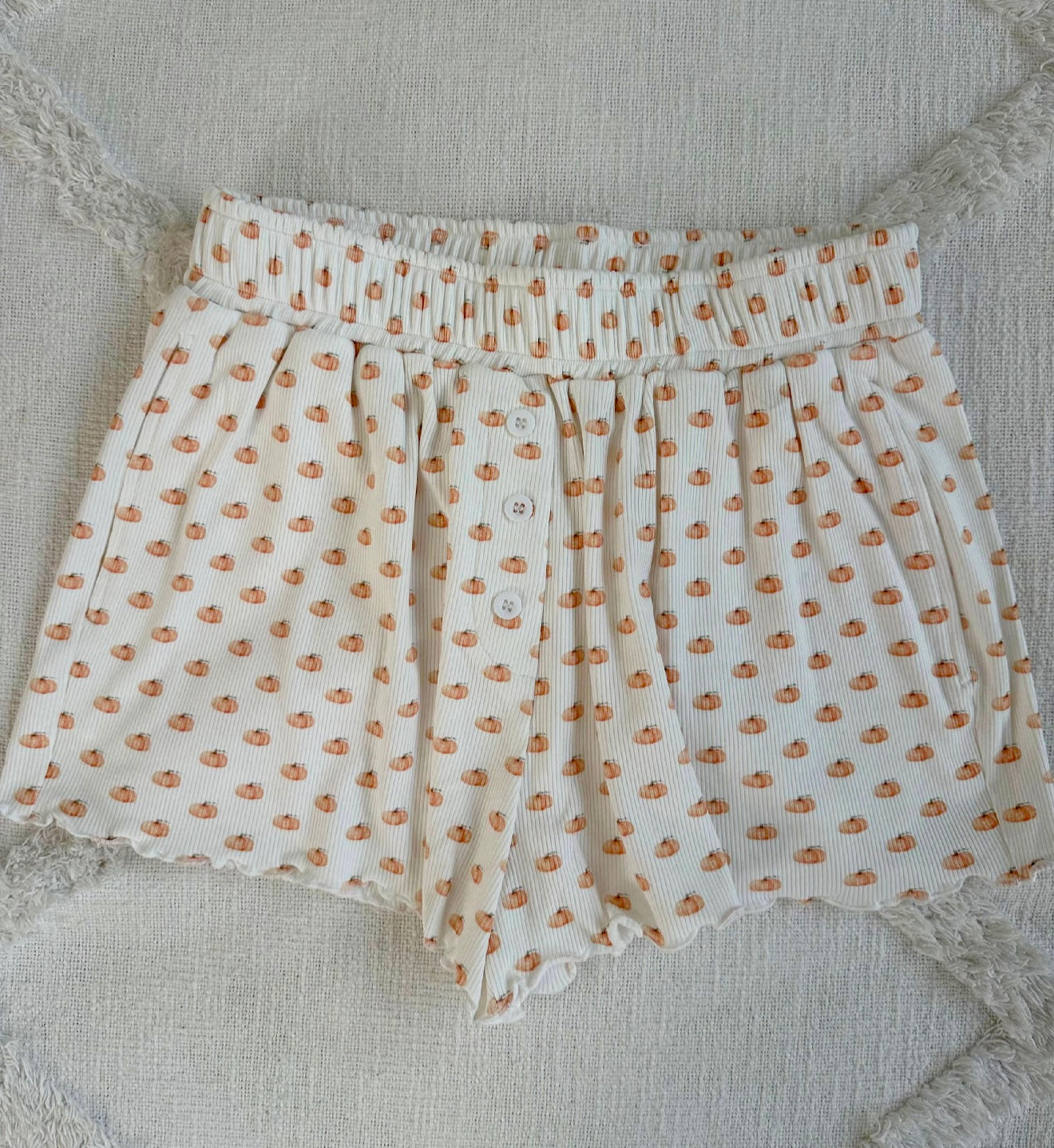 Cozy ribbed shorts sprinkled with tiny pumpkins—stretchy, flattering, and made for movie nights.