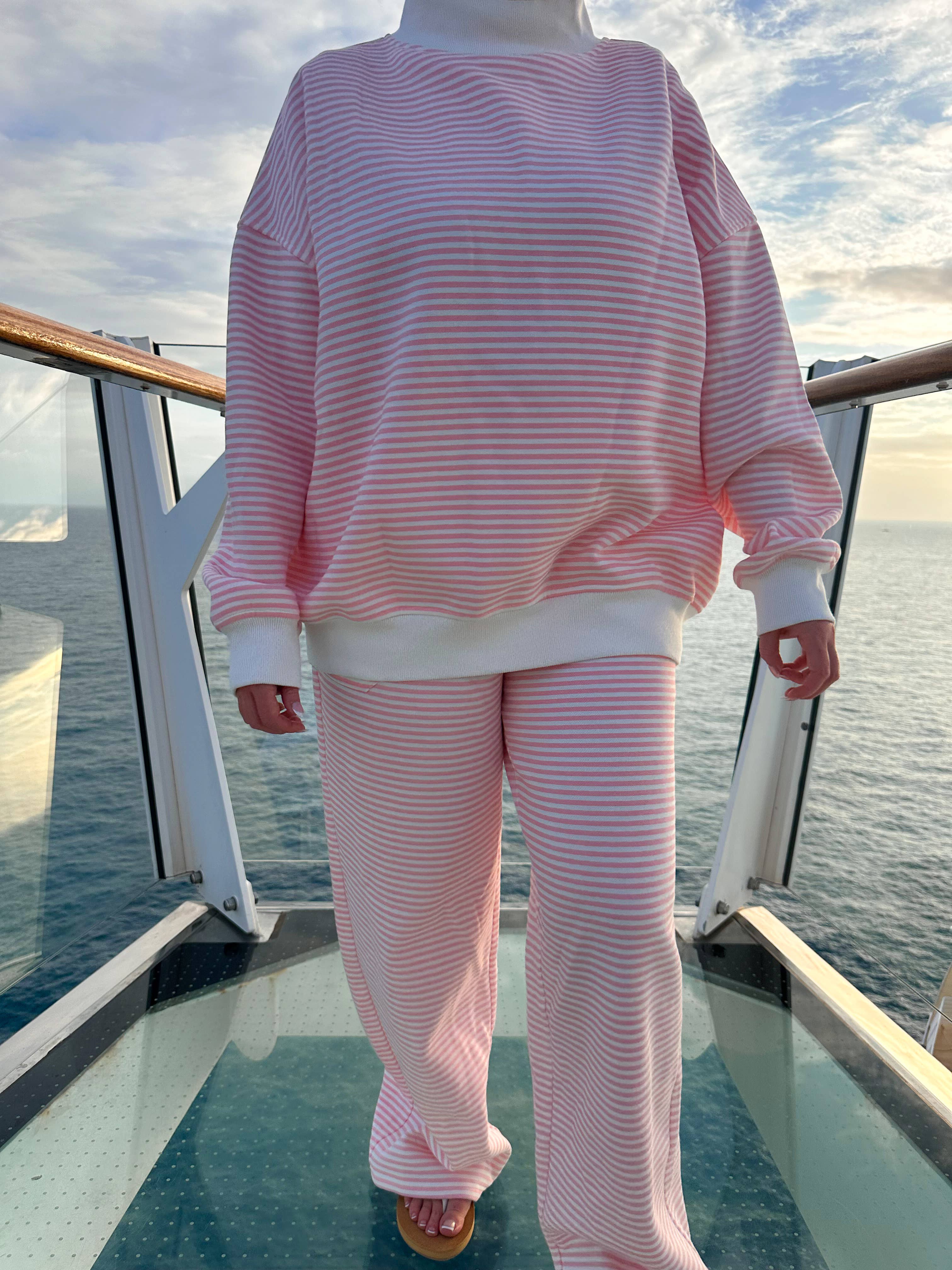 Slip into instant comfort. These pink stripe lounge pants feature a relaxed straight leg and elastic waistband in the same plush, mid‑weight knit as the matching crewneck. Side pockets add quick‑errand practicality while the stripes keep it sweet and coastal‑cool.