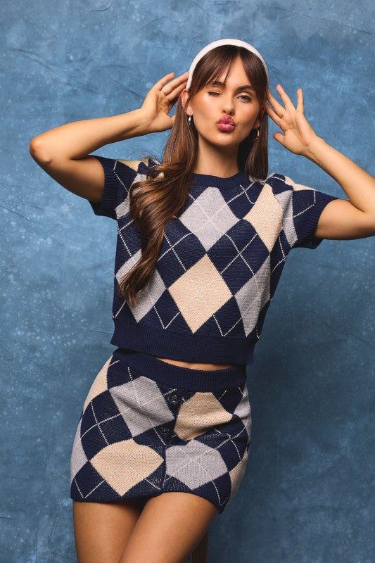 ✨ Style as a statement top or match it with the Argyle Knit Skirt for a complete boutique set.