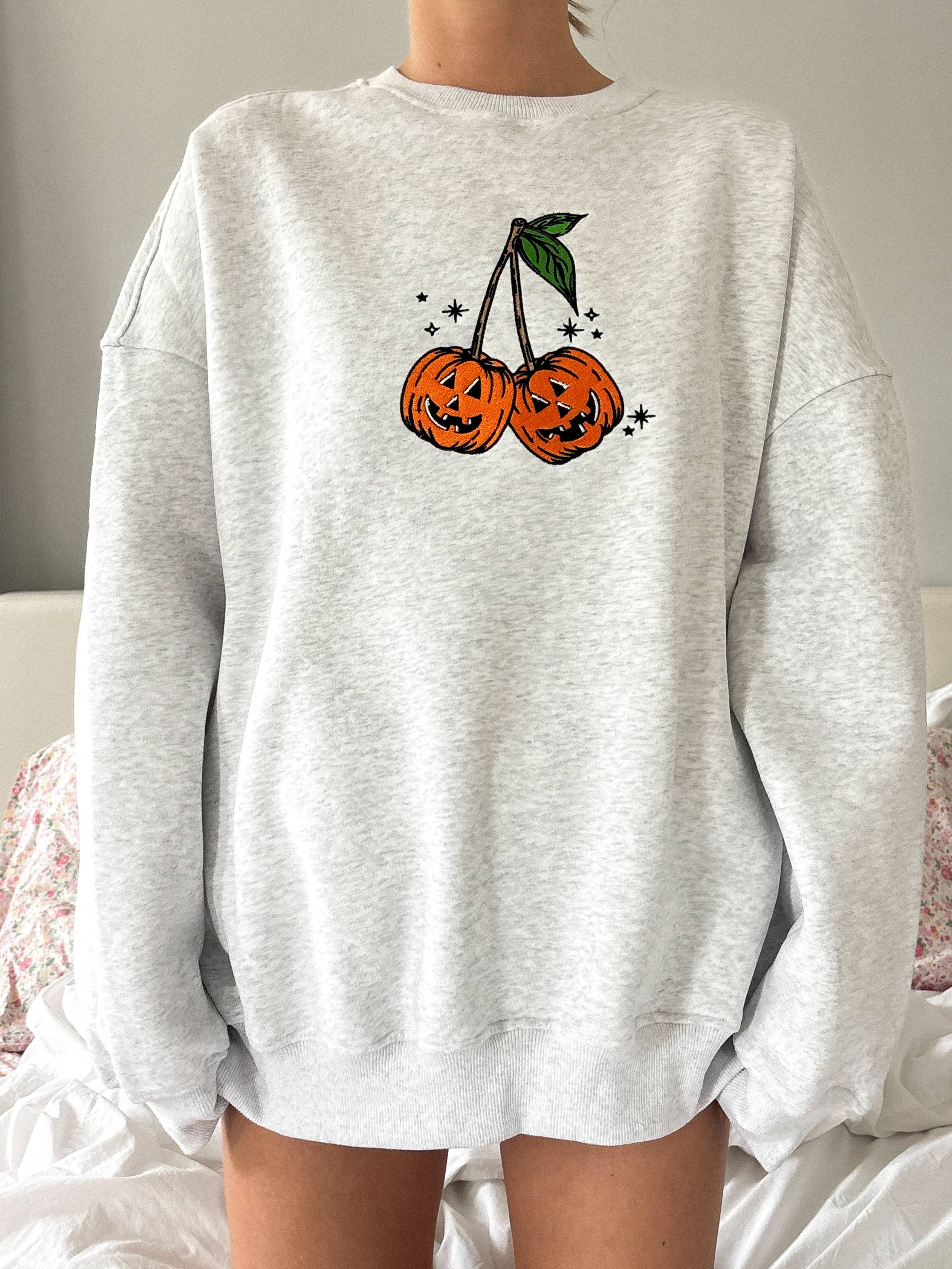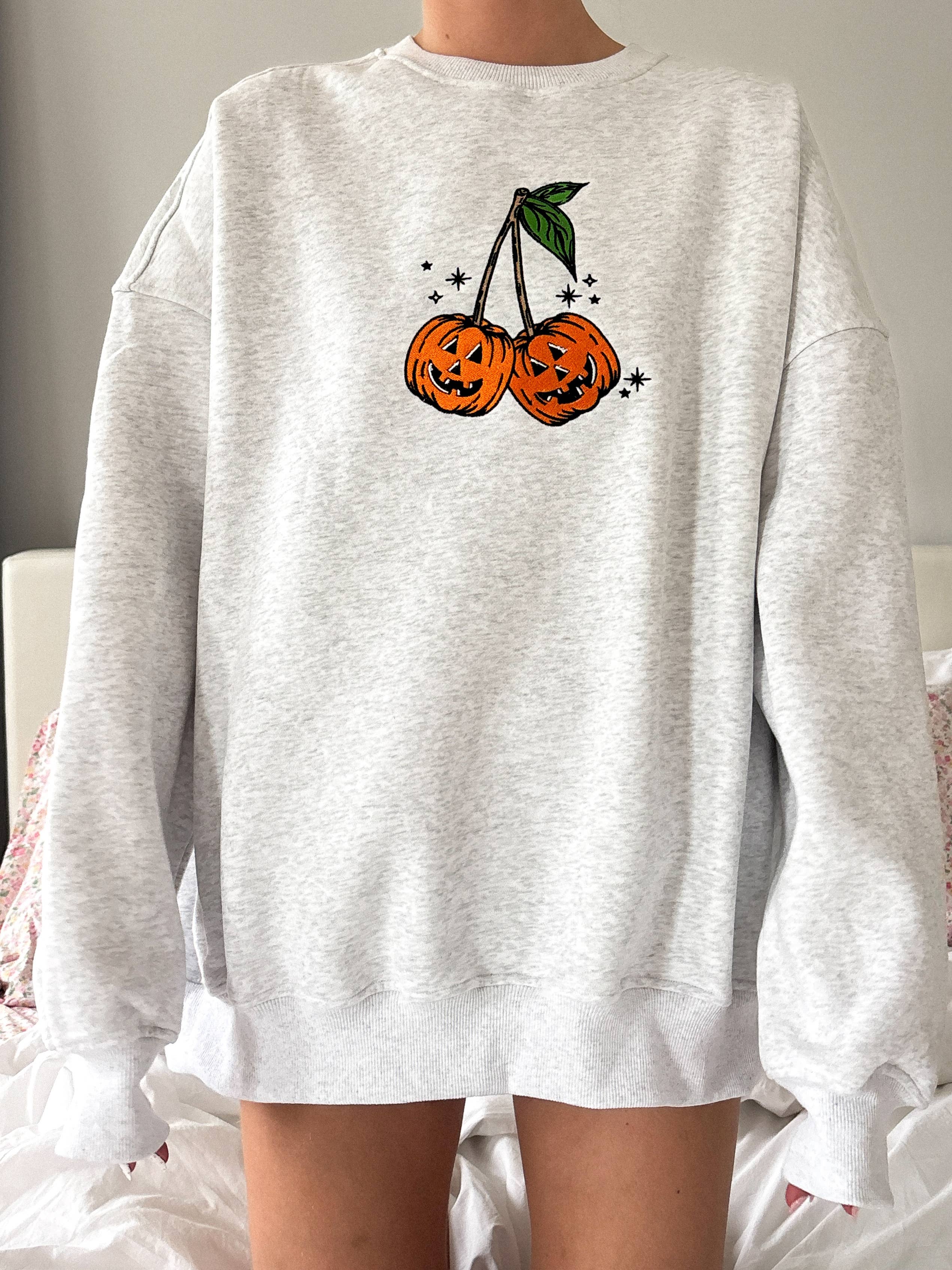 Double the pumpkin fun. This cozy crewneck features bold embroidered jack‑o’‑lantern “cherries” for playful spooky‑season vibes—soft, relaxed, and insanely comfy.