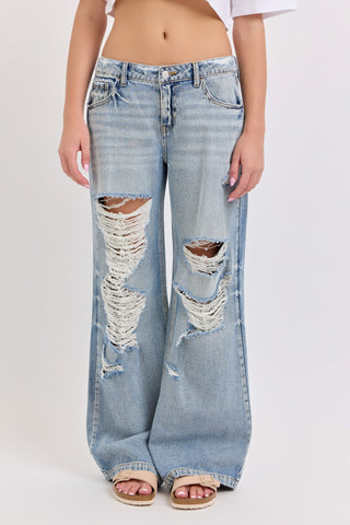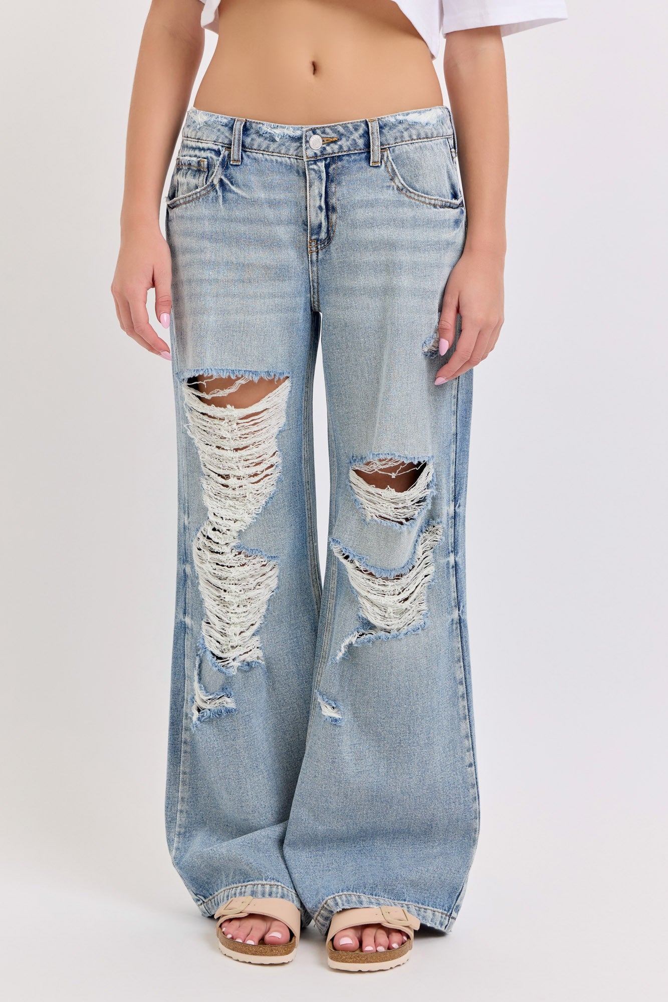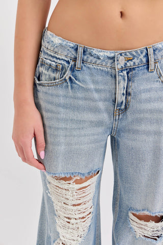 Experience effortless style with the Cello Low Rise Wide Leg Jean. Crafted from 100% cotton, these light denim jeans offer a comfortable, breathable fit. Their baggy, wide-leg silhouette and distressed details create a trendy, laid-back look perfect for any casual occasion. Embrace a fresh, confident vibe with these versatile jeans that combine comfort and fashion seamlessly.