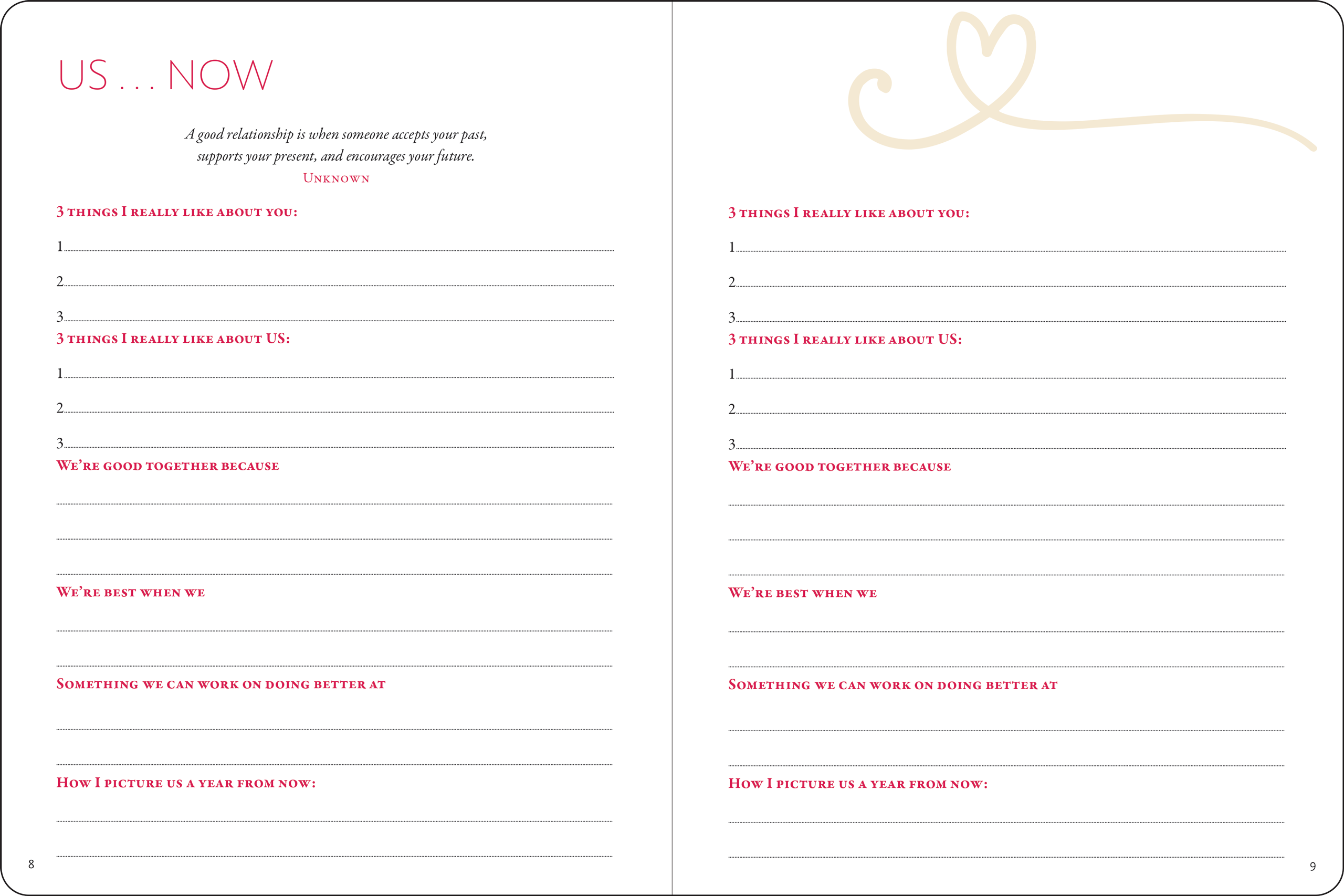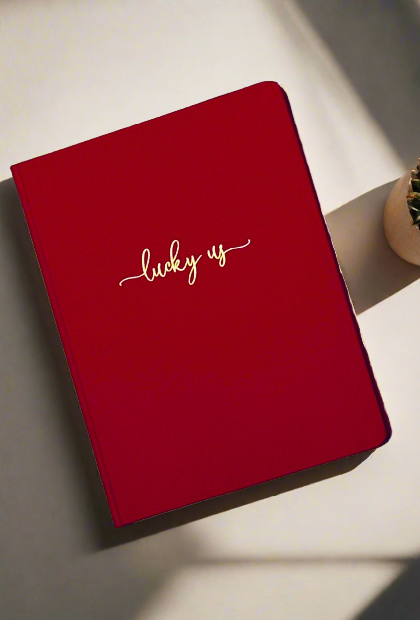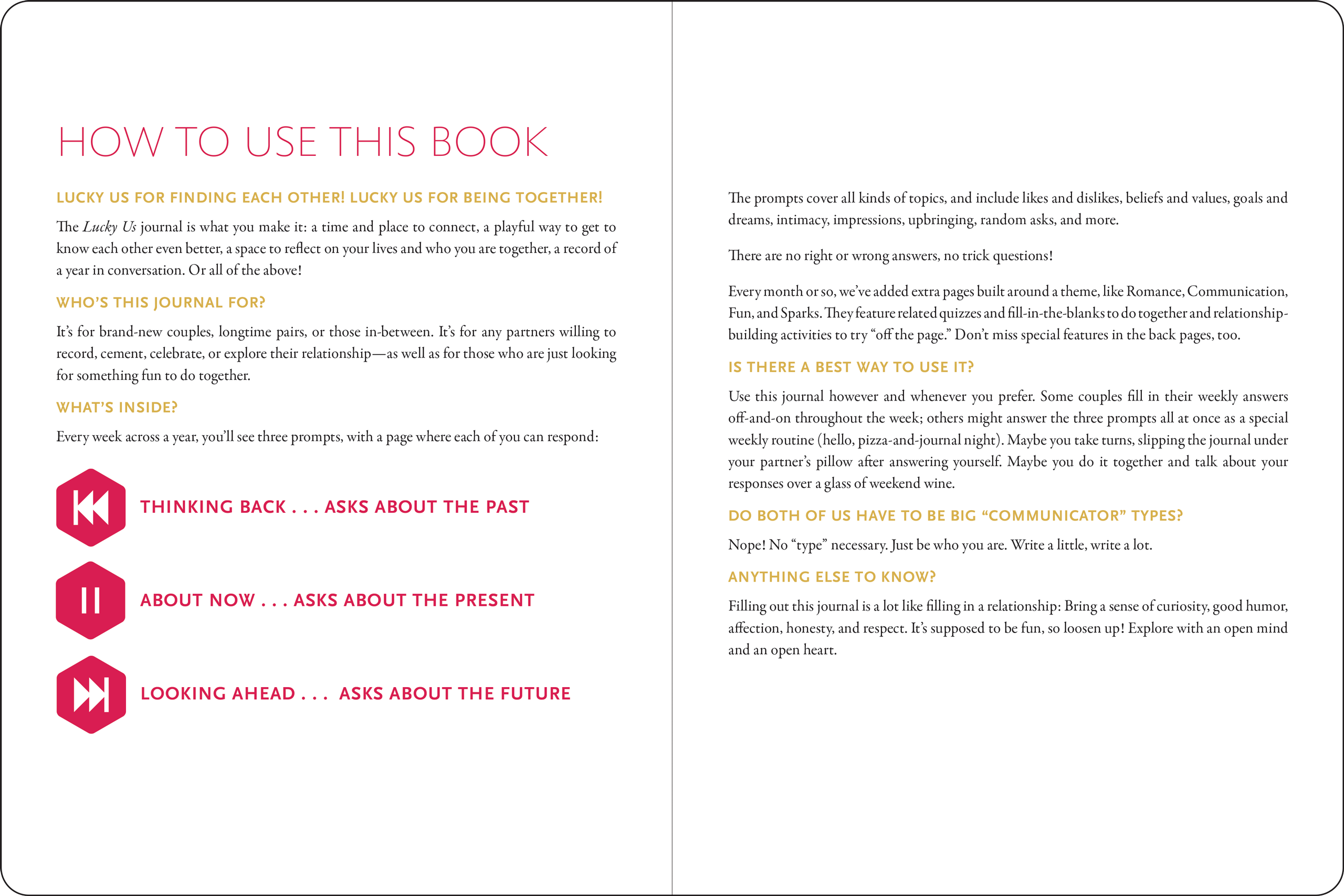 Deluxe Cloth-Covered Edition! Gorgeous Lucky Us keepsake journal encourages couples to connect with each other. A year of weekly prompts spark you and your partner to share it all -- likes and dislikes, beliefs and values, goals and dreams, intimacy, ideas, and more! Each month, connection pages feature quizzes and fill-in-the-blanks. Have fun getting to know each other even better as you record a year in conversation together! Tuck notes, mementos, and more within the pocket inside the back cover. A matching ribbon bookmark keeps your place. Beautiful keepsake journal features a deluxe cloth cover stamped in gold. Removable cover band. Durable hardcover binding. Journal measures 6-1/4'' wide x 8-1/4'' high. 144 pages.