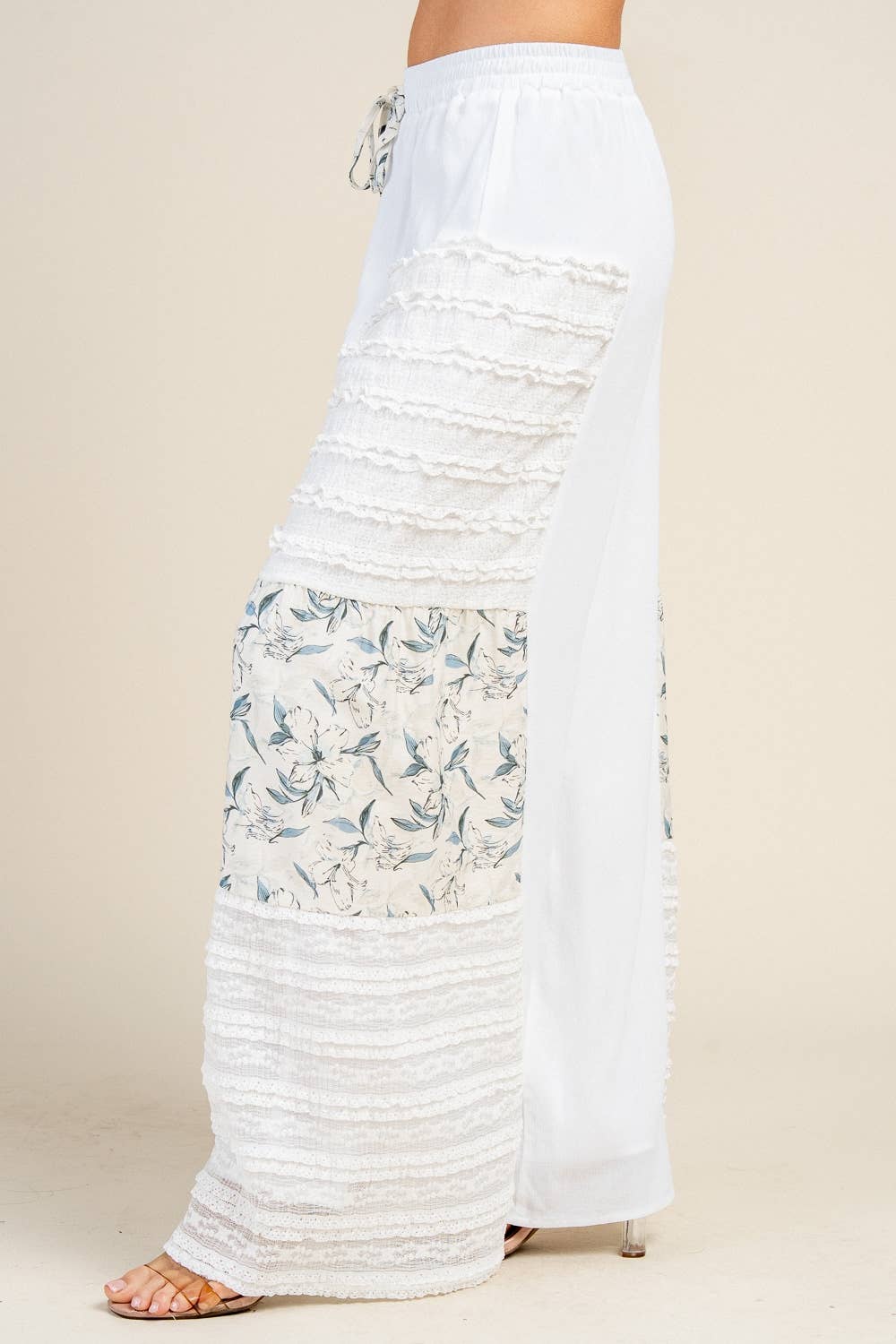 The delicate floral mix-media panels add a romantic touch, while the lightweight fabric keeps them breathable and comfortable. Featuring an elastic waistband with adjustable tie detail, they offer both style and ease.