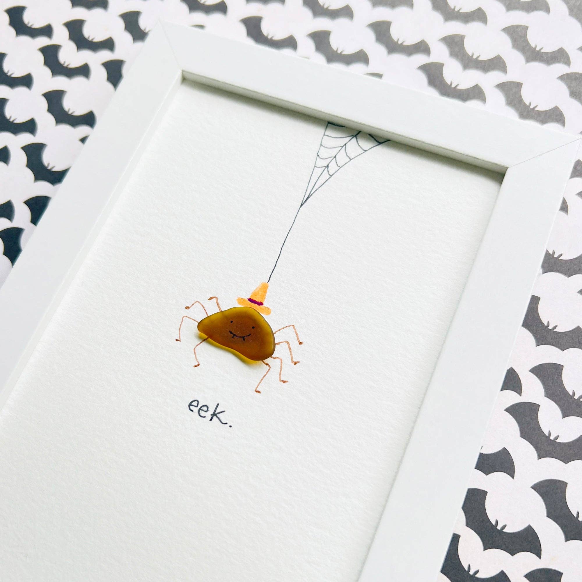 EEK! Original sea glass artwork featuring an adorable spider made out of brown glass. Perfect for Halloween or any spooky occasion! All sea glass is found by artist Ashley Lucas and her son on their morning walks on the Jersey Shore. * Each and every sea glass piece is unique and made to order. If the selected piece is not in stock, please allow up to 5 days for the piece to be made before shipping. There may be slight imperfections in the pieces of glass, and overall appearance may vary slightly from the photos provided here. * Presented within a 4"x 6" white frame with acrylic plexiglass frame cover situated *behind* the embellished print due to the sea glass pieces being three dimensional. ** All of our frame suppliers have switched to acrylic and plexiglass sheets instead of glass to increase safety and non-breakage - please note frame artwork weight may vary **