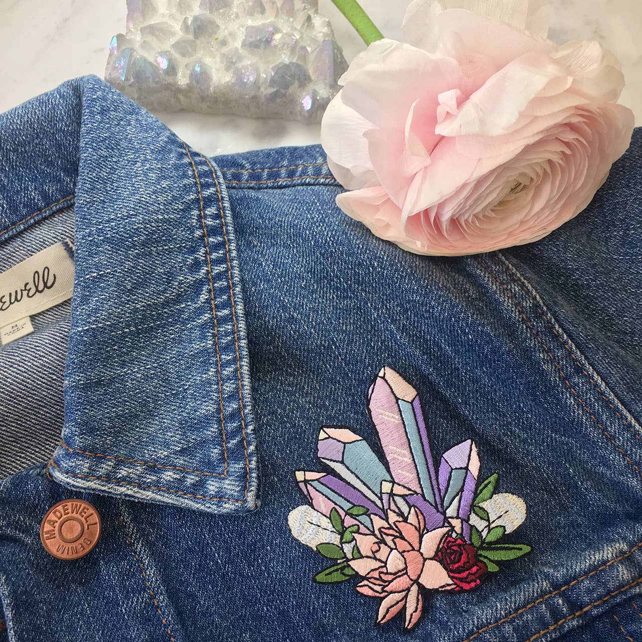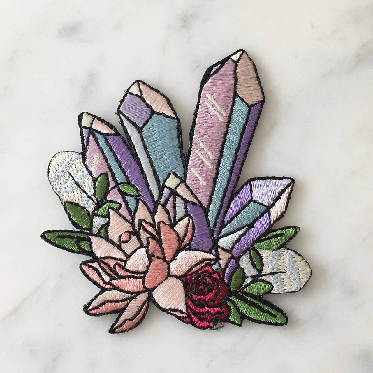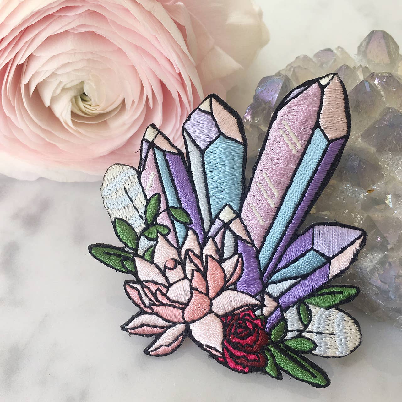 Super charge your aura with this crystal cluster iron on patch. Crystal points in shades of pastel lilac (to represent amethyst) & blue accented with a pink lotus, wild red rose, & feathers.