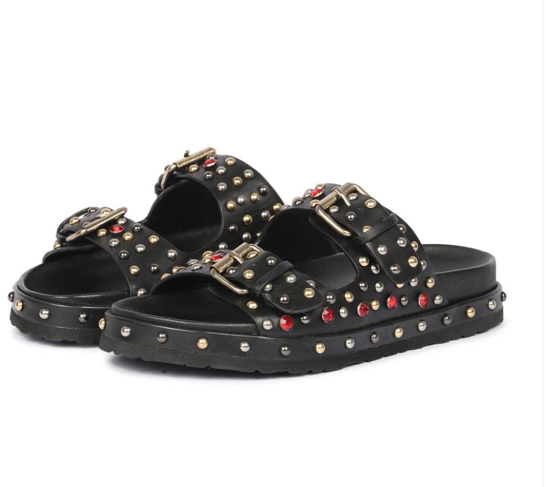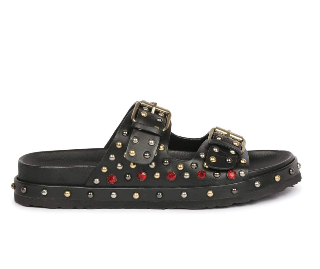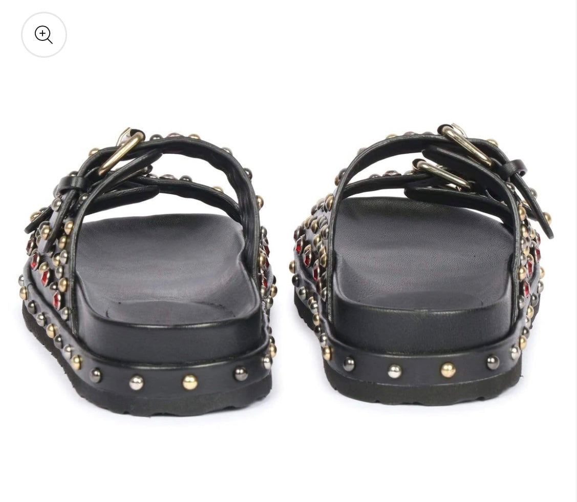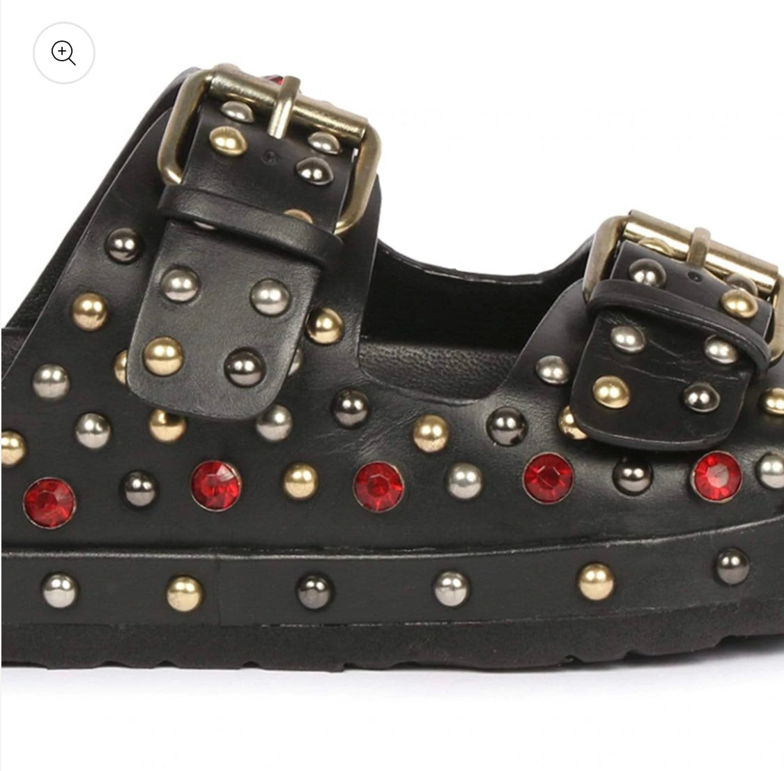 Super-comfortable handcrafted white leather flat with multi stud detail. upper and mid sole embellished with multi studs. This double-strap slip-on sandals can be adjusted by the double buckles on top to find the most comfortable position, breathable leather lining, rubber sole and padded leather footbed allow you to wear the latest styles in lasting comfort.  This open toe makes up the rest of the must have style. Made perfectly with the finest material and quality products.