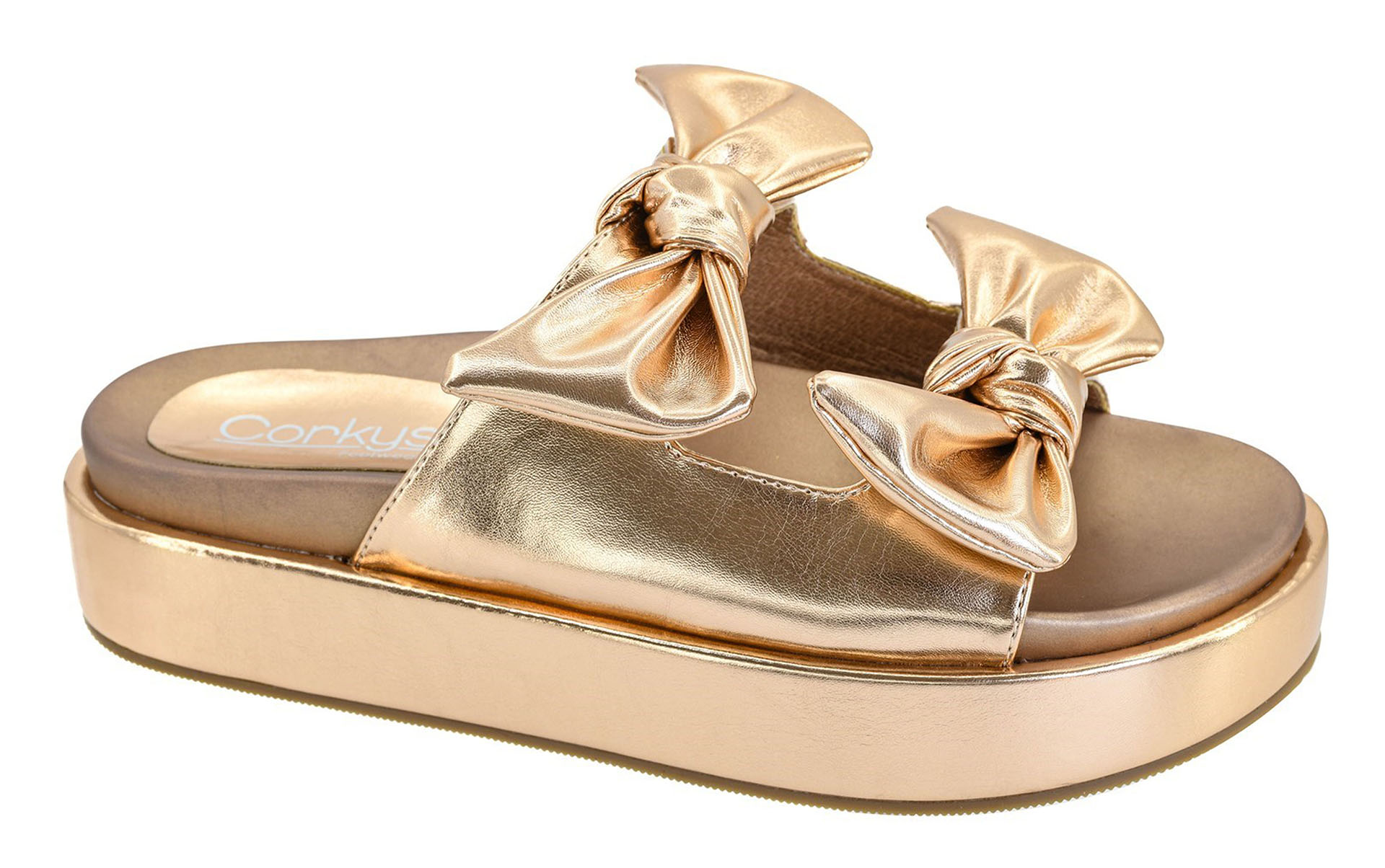 Step into glam with the Corkys Rose Lil Bit Knotty Rose Gold Metallic Bow Platform Slides—where comfort meets bold, playful style! Featuring two oversized metallic gold bows, these eye-catching sandals add instant shine to any outfit. The cushioned footbed ensures all-day wearability, while the chunky platform sole gives you that added lift without sacrificing comfort. Perfect for brunch dates, beach boardwalks, or dancing under the stars.