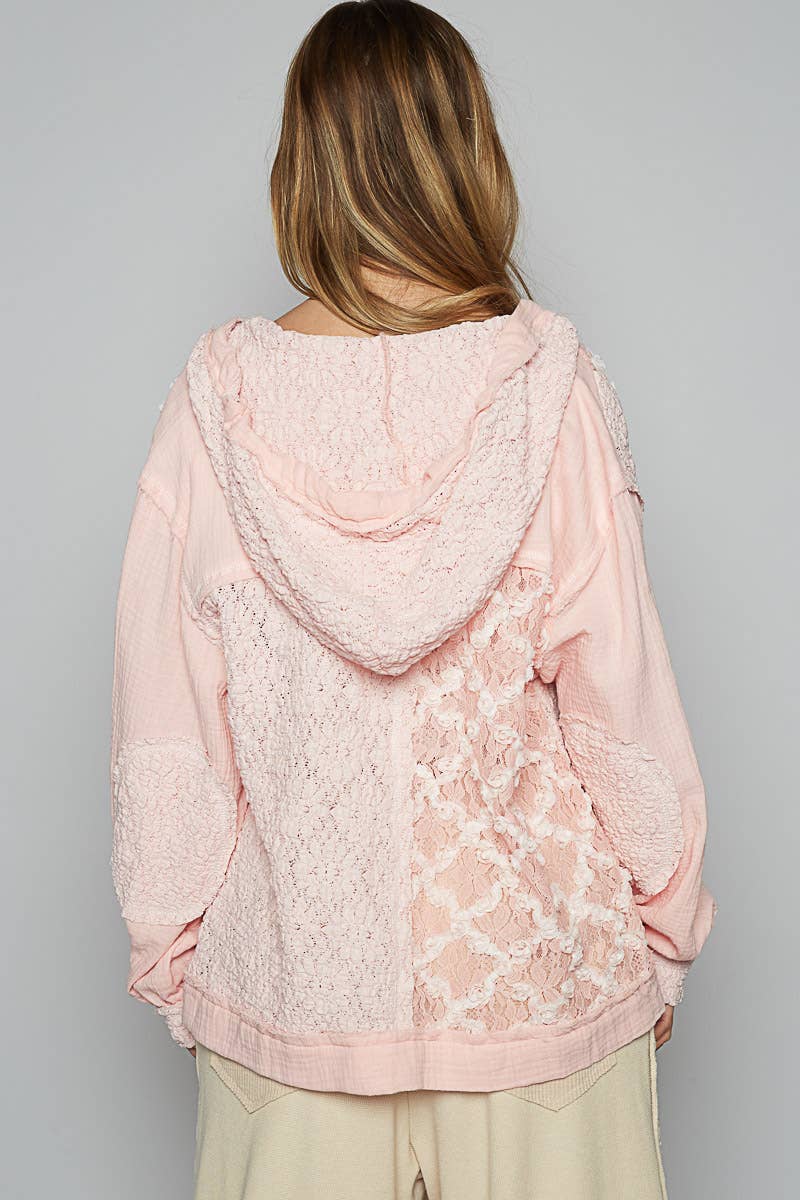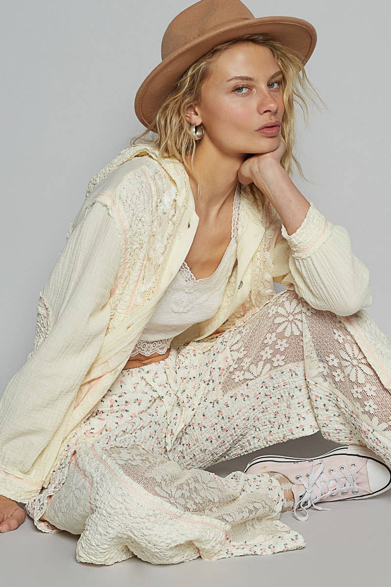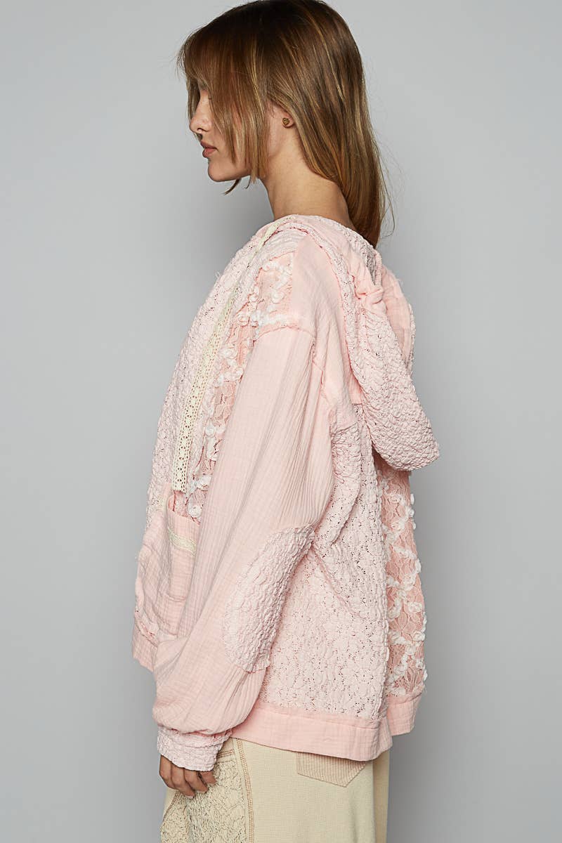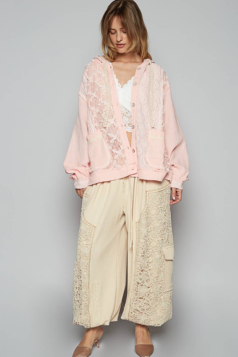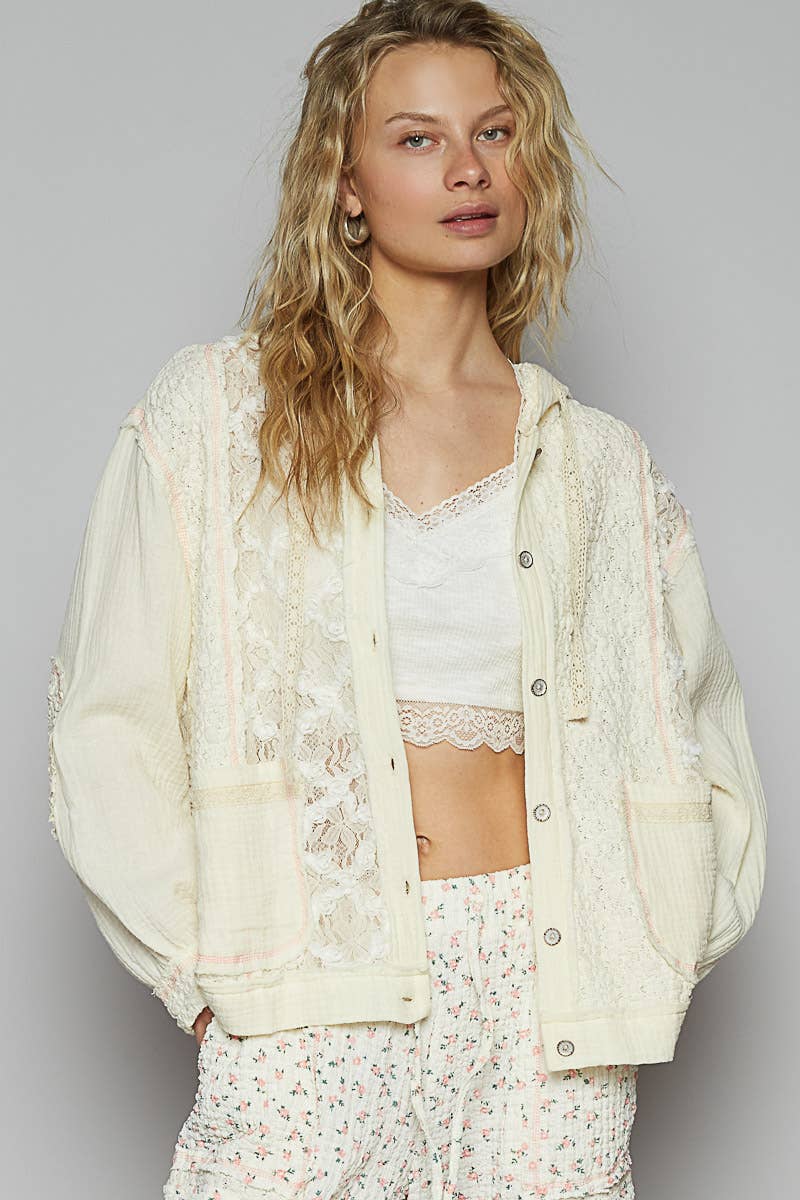 Stay cozy and chic with our Pol Knit Jacket With Lace Balloon Sleeves! This jacket features a stylish hoodie design, elegant balloon sleeves, and a relaxed fit top in intricately patterned lace. Perfect for any occasion, it's sure to keep you warm and fashionable. (Jacket is approximately 24-3/4" long with a bust of 23", 19-1/4" shoulder width, and 23" sleeves.)