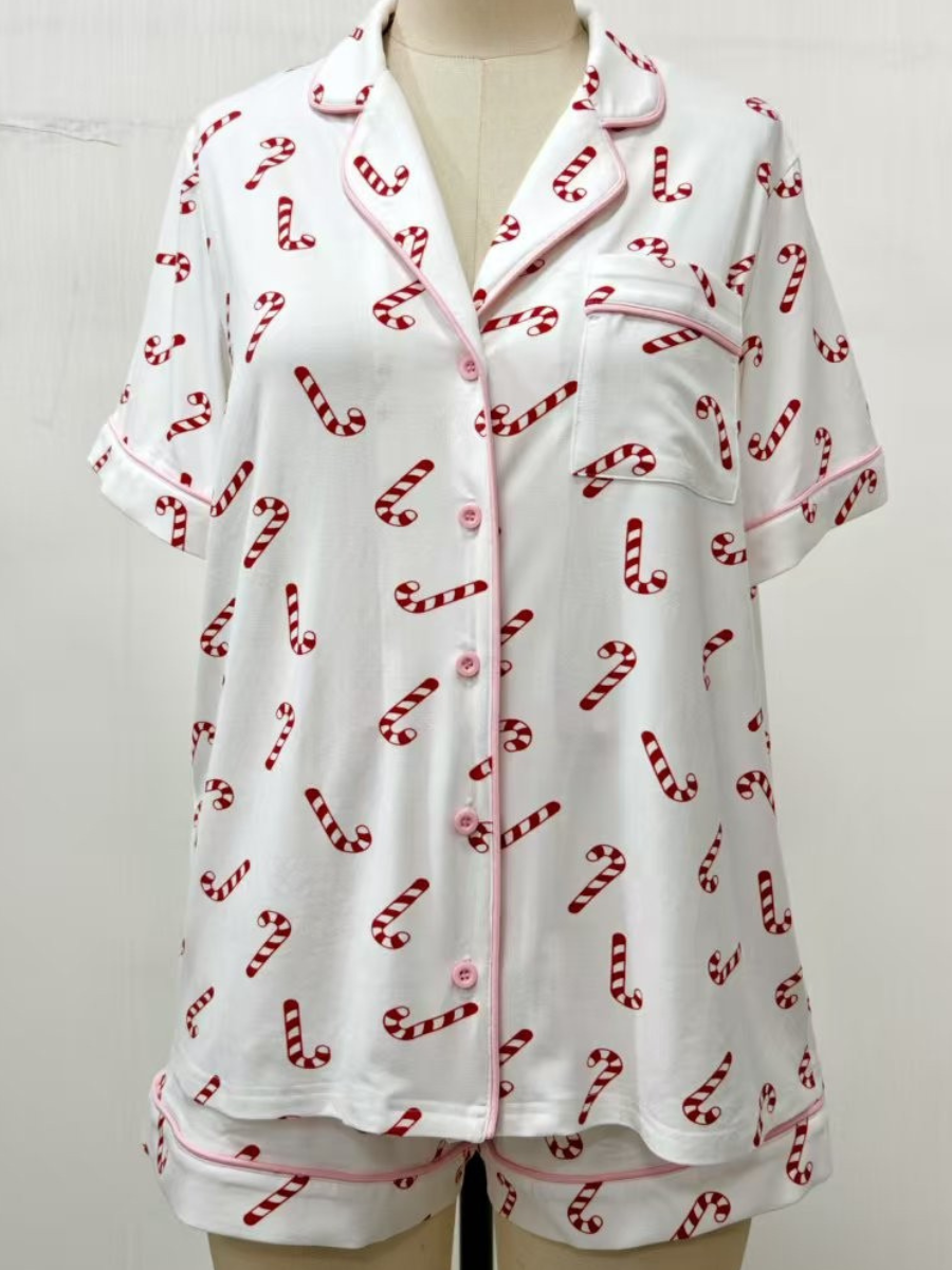 Get ready to sleigh all season long in cozy style with the Sunkissed Coconut Candy Cane Pajama Top. This festive short-sleeve button-up features a playful red and white candy cane print, soft pink piping, and a relaxed fit that’s perfect for lounging or holiday mornings.