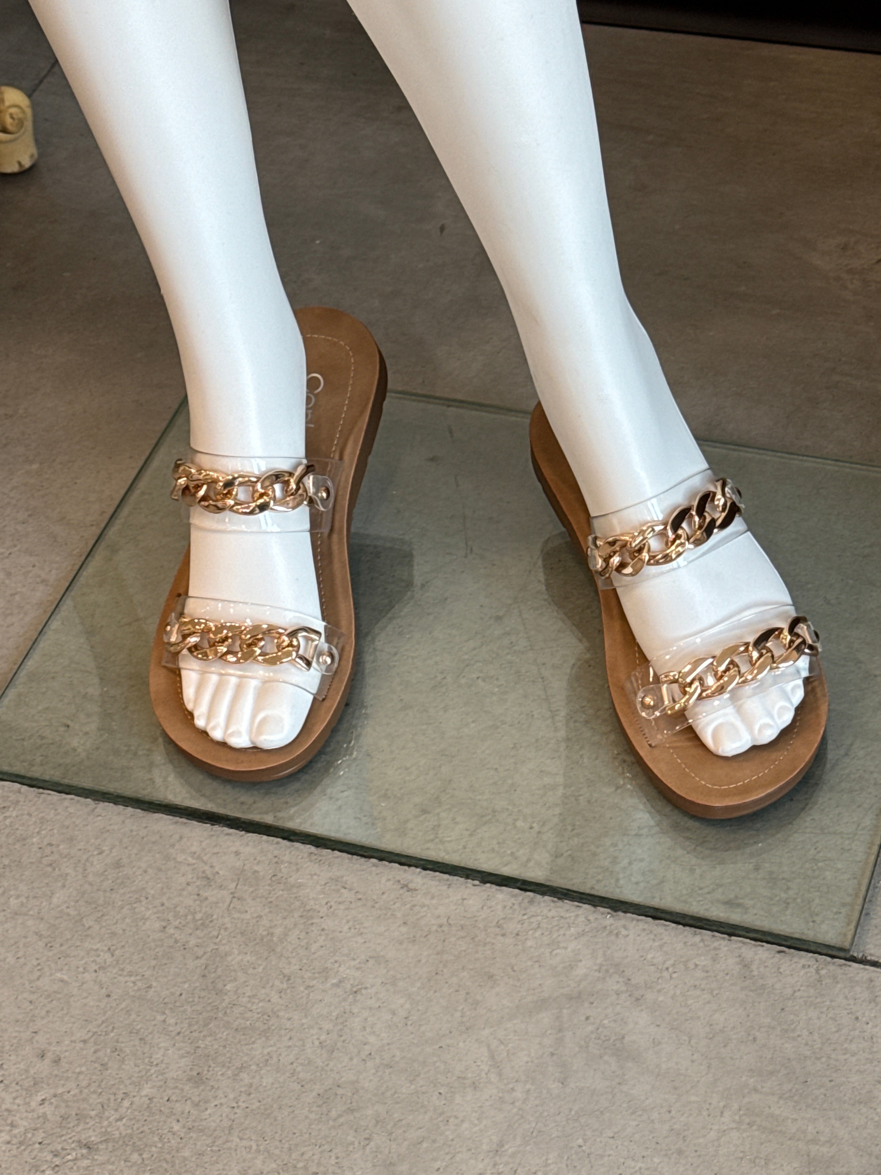 Elevate your style with Corkys Seeing Double Clear Sandals. The chic slide design boasts two faux-leather straps with gold chain detailing for a modern touch. Comfort is ensured with the cushioned footbed and durable sole, making this sandal a versatile choice for everyday wear. Effortlessly stylish and true to size, pair with any outfit for a polished look.