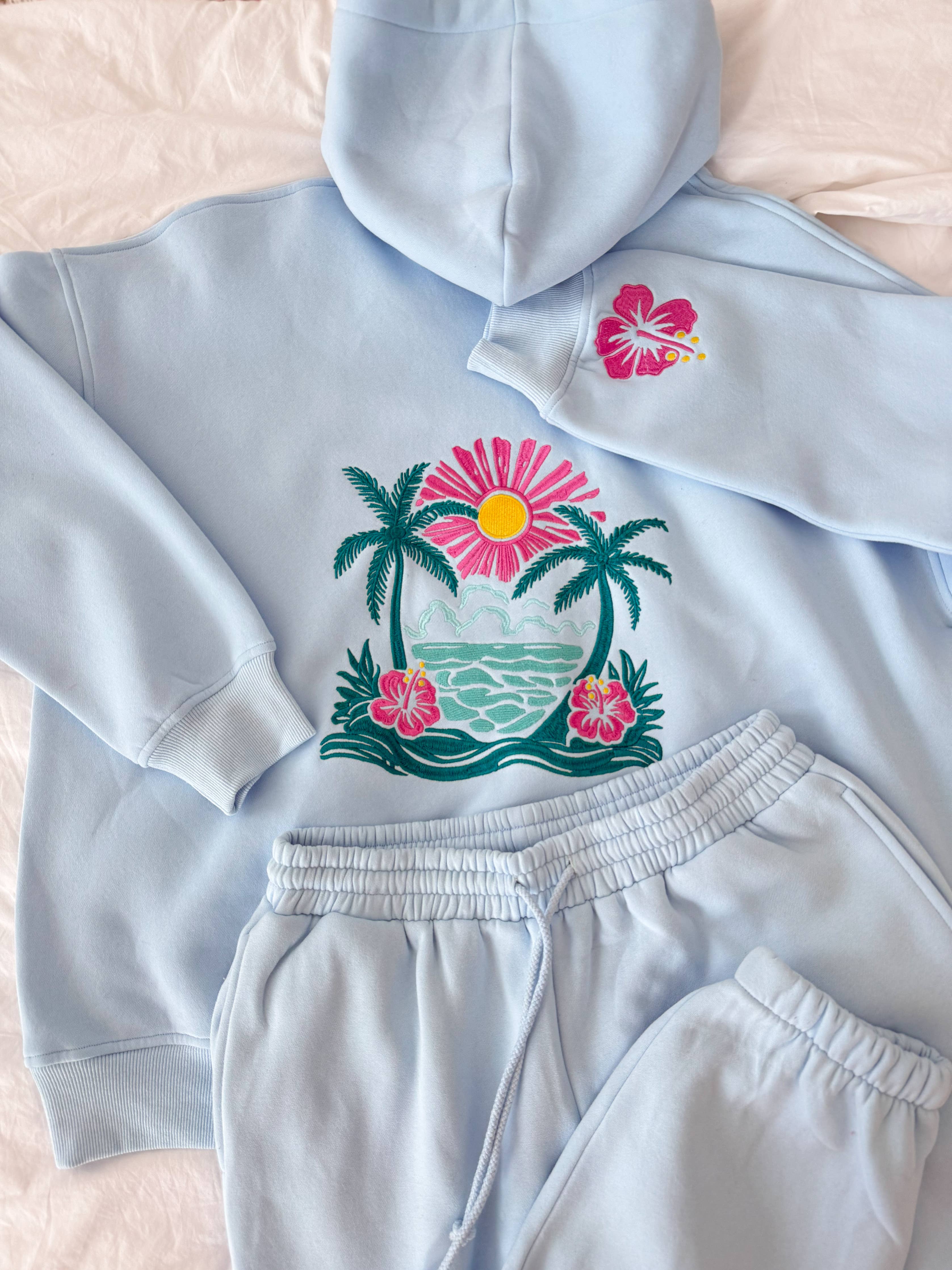 Cozy up with a splash of fun in the Sunkissed Coconut Icy Blue Hibiscus Flower Beach Babe Embroider Hoodie. Soft, snug, and bursting with playful beach vibes, this hoodie brings a bright touch of tropical charm to your laid-back days. Perfect for those who love comfort with a twist of beachy style!