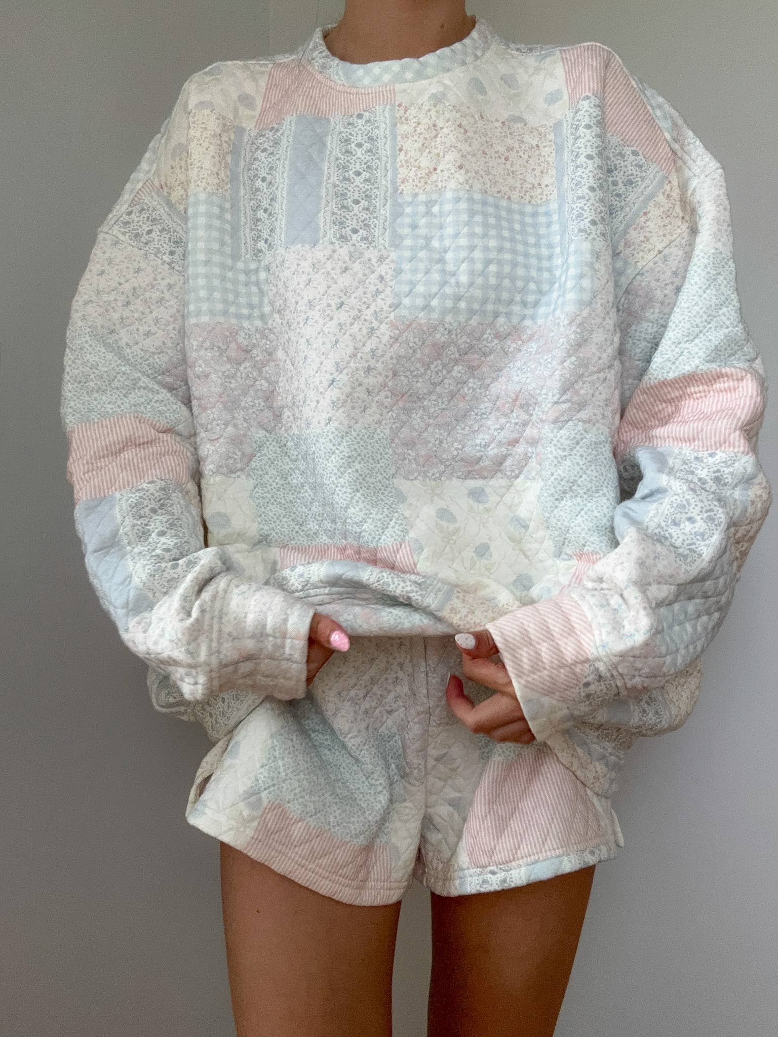 This quilted crewneck channels cottagecore charm with a pastel patchwork print and diamond‑stitched texture. The roomy, drop‑shoulder cut layers beautifully over tanks and tees, while rib trim keeps the shape. Style it with the matching joggers for errands or the shorts for movie night.