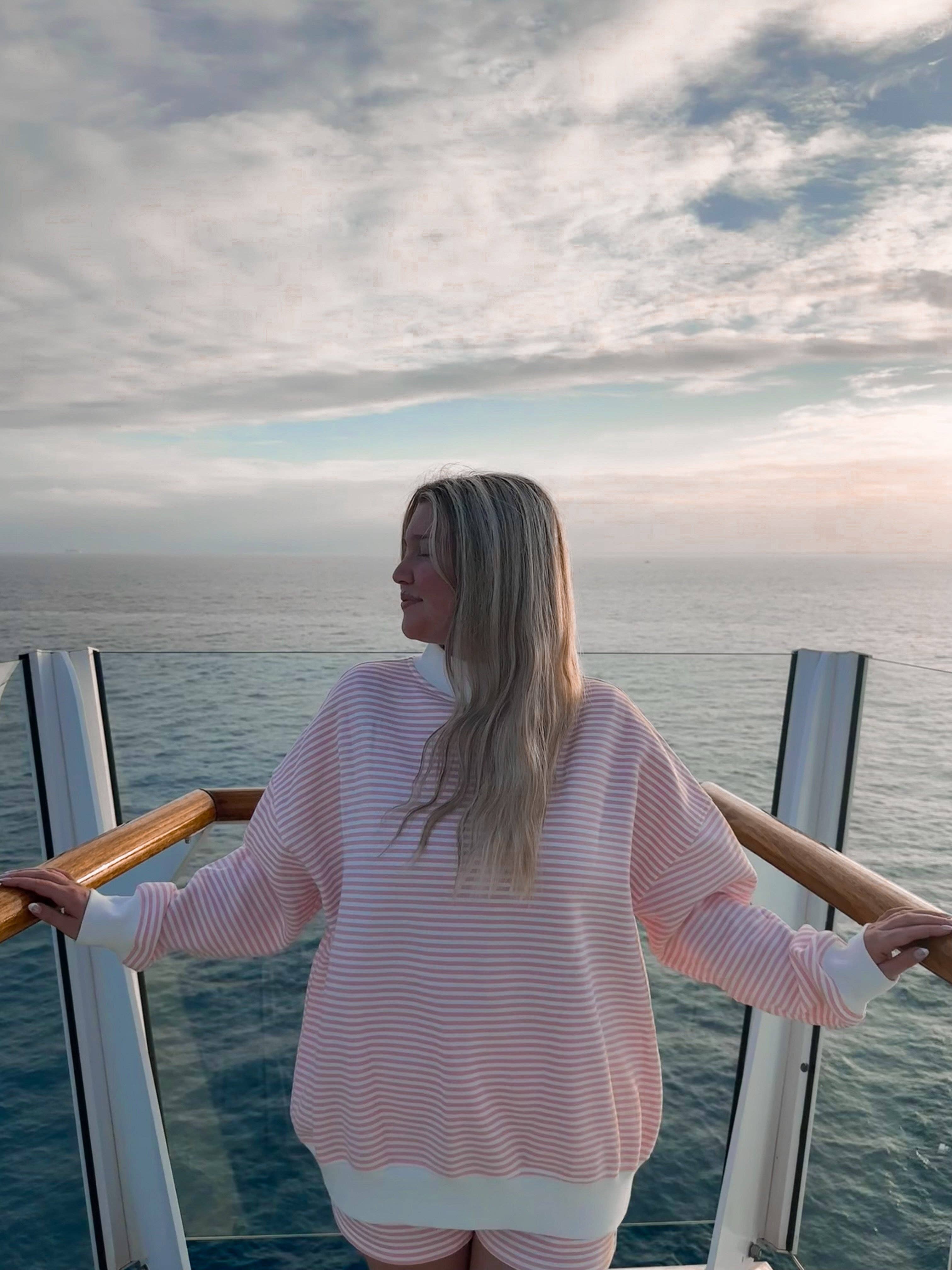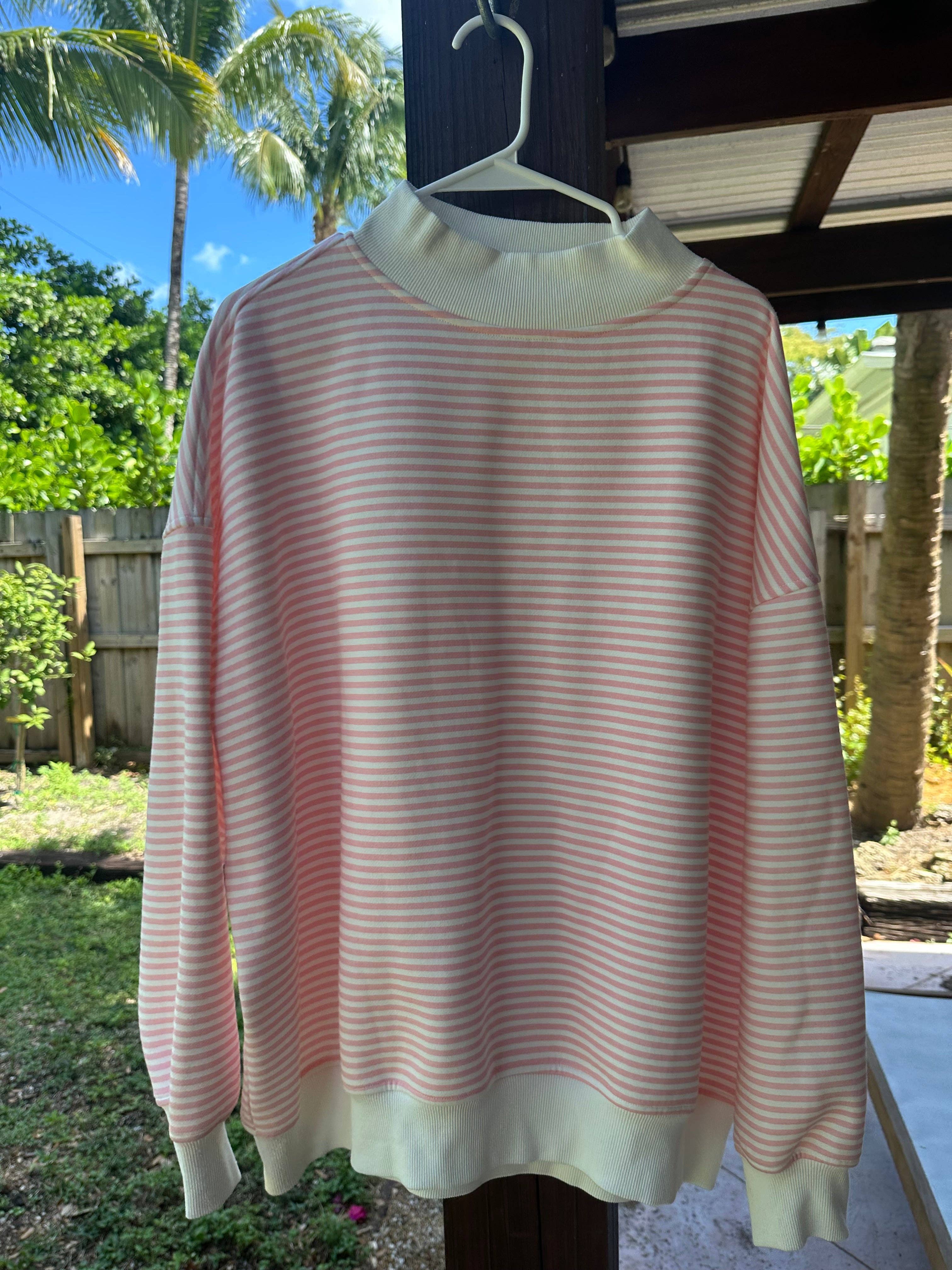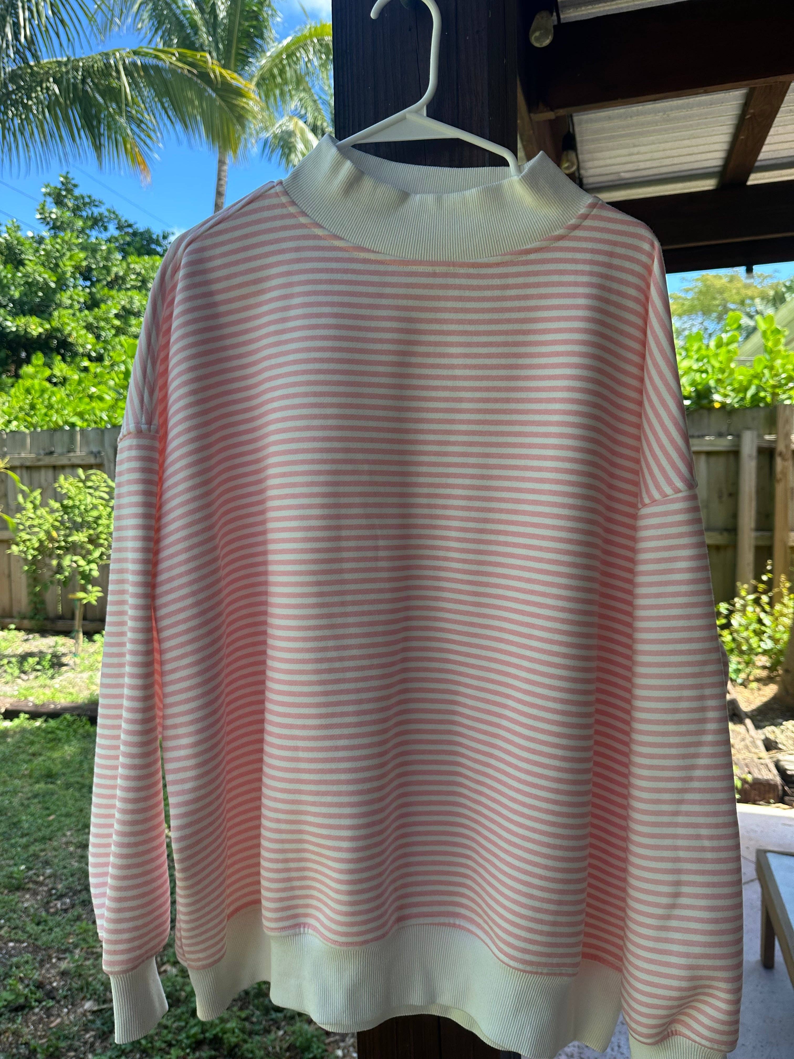 Cuddly and coastal—an oversized pink stripe crewneck that makes every day feel like a slow Sunday.