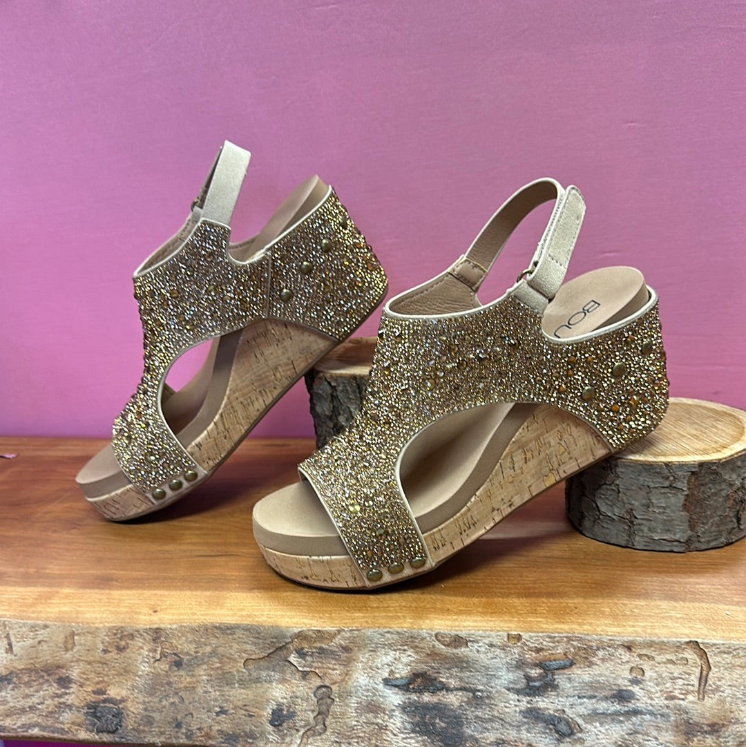 Step into the spotlight with Corkys The Ashley Wedge! These rhinestone-studded beauties offer the same beloved fit as the Carley sandal but with an extra dash of bling for a night out. With a 3 inch heel and 1 inch platform, these shoes elevate any outfit. Plus, they're true to size and perfect for wide feet. Size up if you're a half size. Who says comfort and style can't go hand in hand?