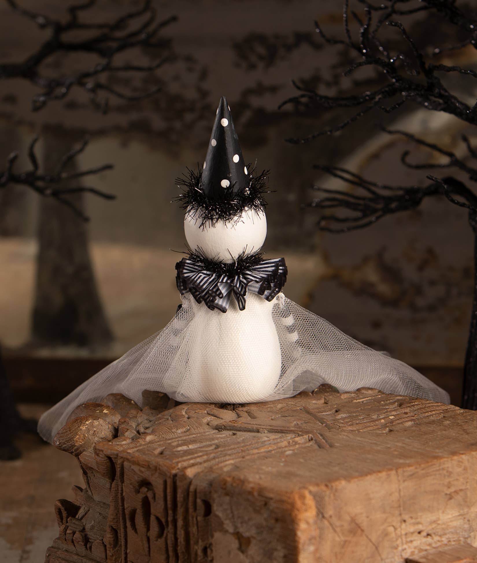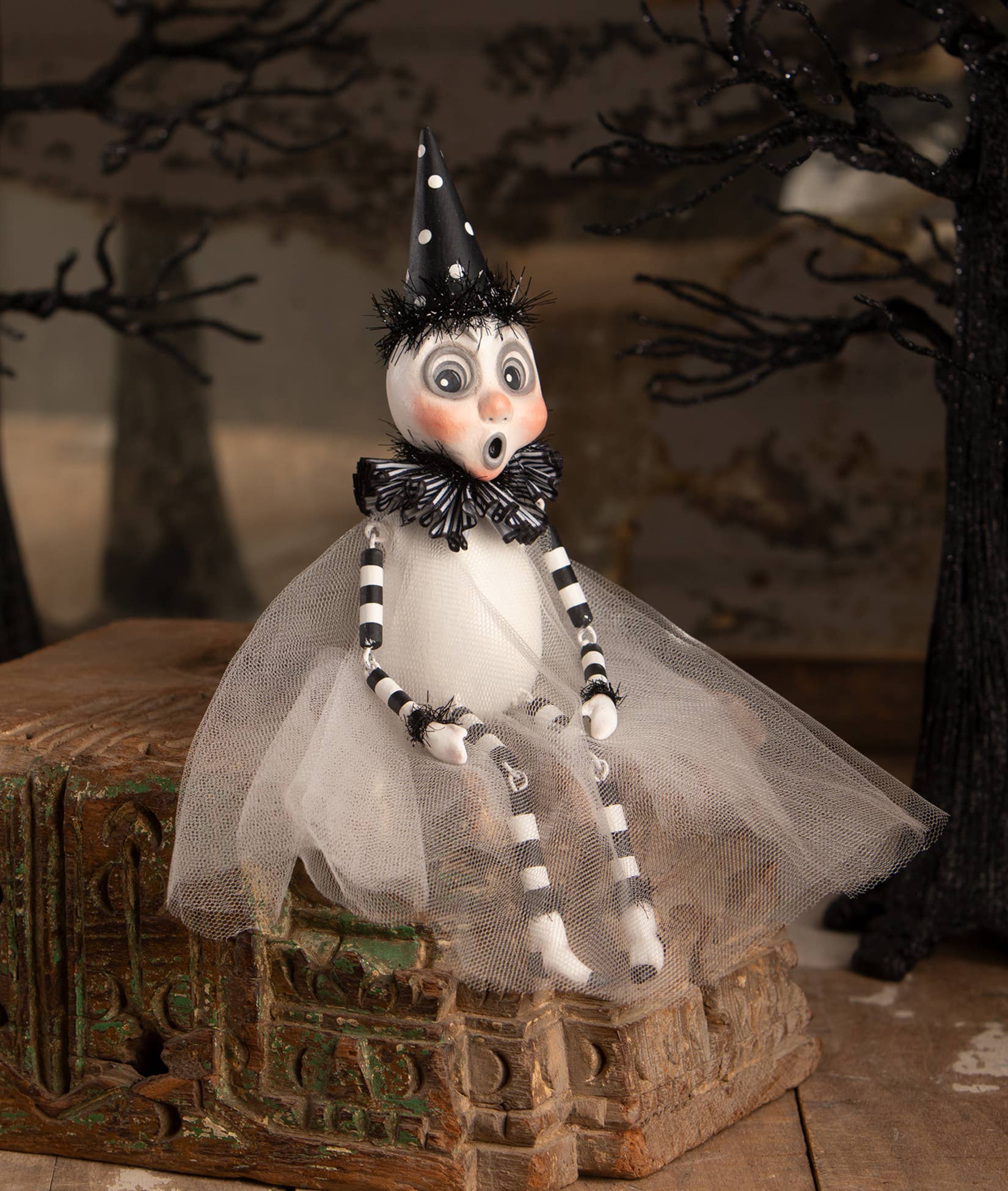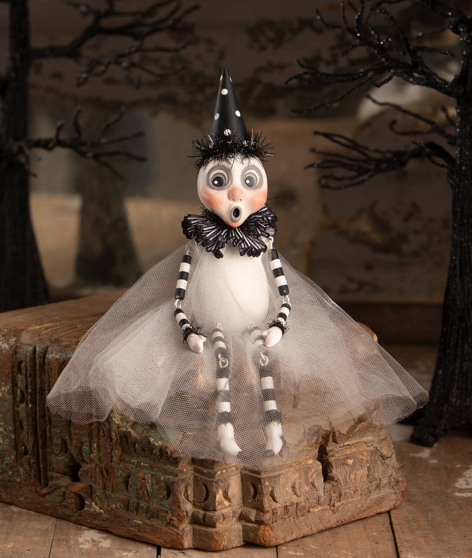 Add a touch of spooky fun to your halloween decor with the party ghost sitter by leeann kress! This adorable ghost, complete with a festive party hat, features dangle arms and legs that you can position to sit perfectly on a shelf or a stack of books. Dressed in a long gauze overlay and sporting a surprised o-shaped mouth, this ghost is full of charm and ready to liven up your halloween display. A whimsical addition to any spooky setup! Hand-painted resin, tulle, tinsel, ribbon, wire, and pressed paper.