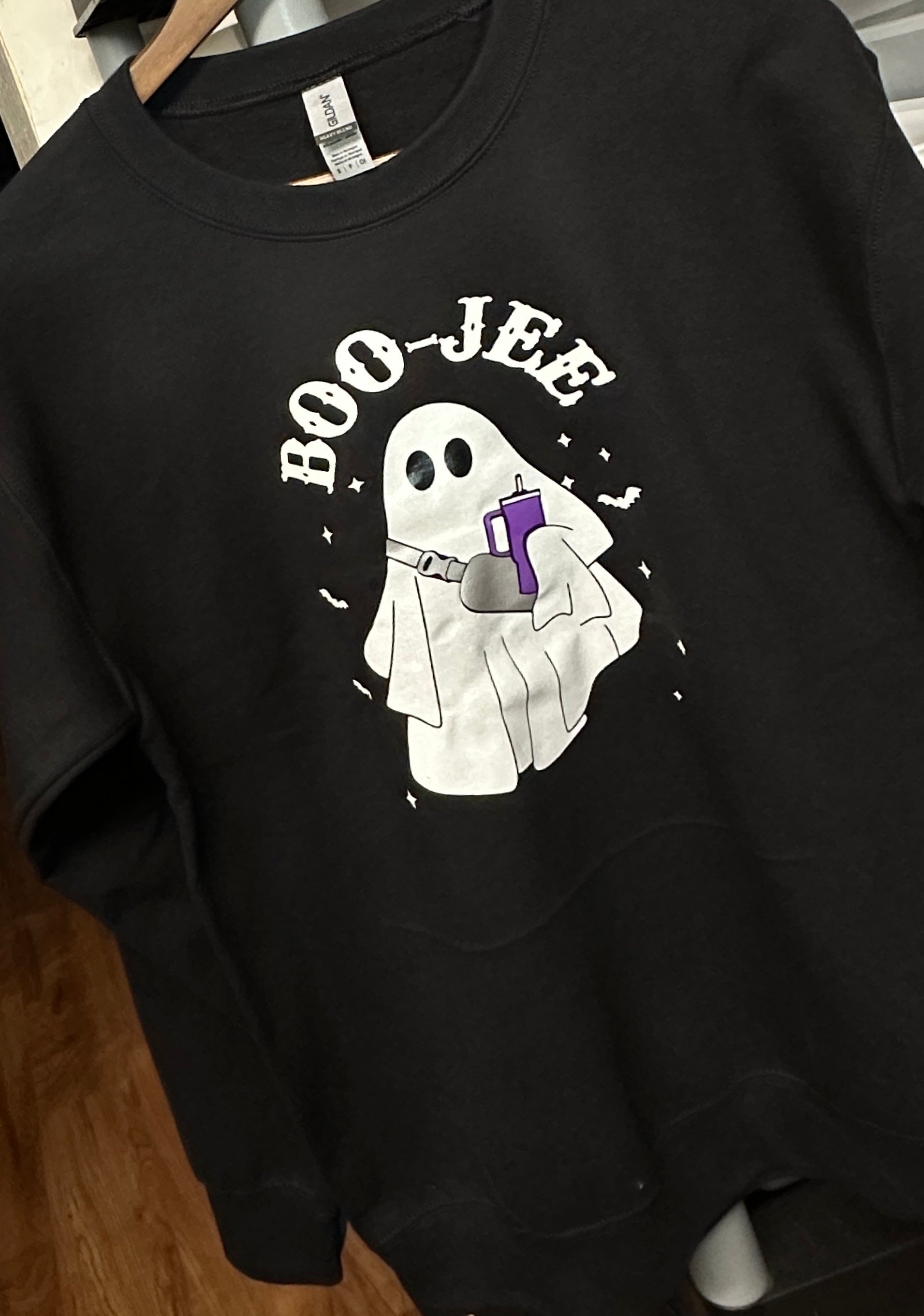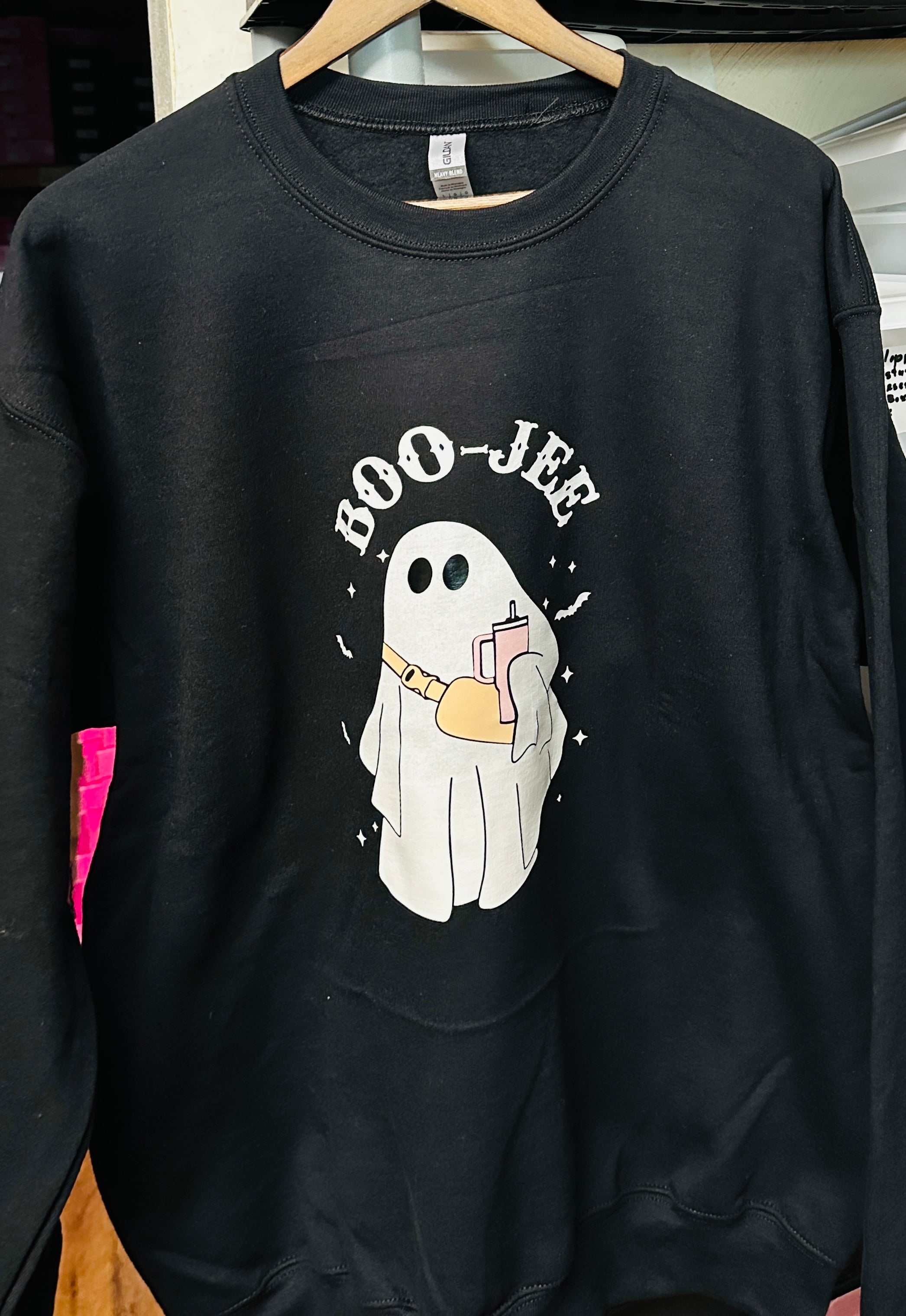 It's a Boo-Jee Ghost Party! Our adorable Boo-Jee Sweatshirt is perfect for halloween! She's ready for anything with her trusty tumbler and crossbody - a ghostly-good combo! Get scared silly in style this season!