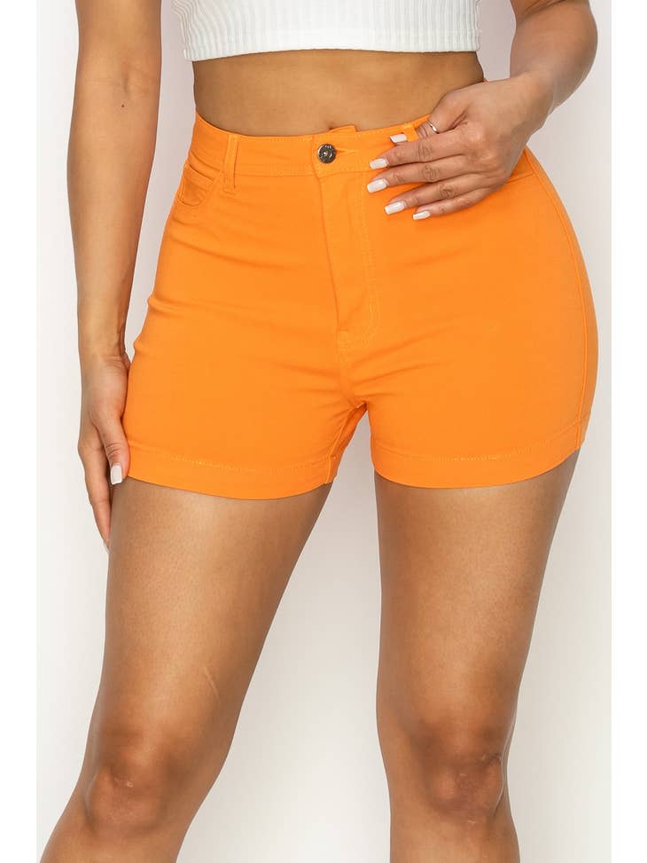 SUPER STRETCHY COLORED SHORTS - HIGH RISE - FITTED MINI SHORTS - BUTTON/ZIP FLY, BELT LOOPS - FIVE-POCKET STYLE WITH TWO FRONT FAUX POCKETS - FINISHED HEM INSEAM: 3 INCH FABRIC: 76% COTTON, 20% POLYESTER, 4% SPANDEX