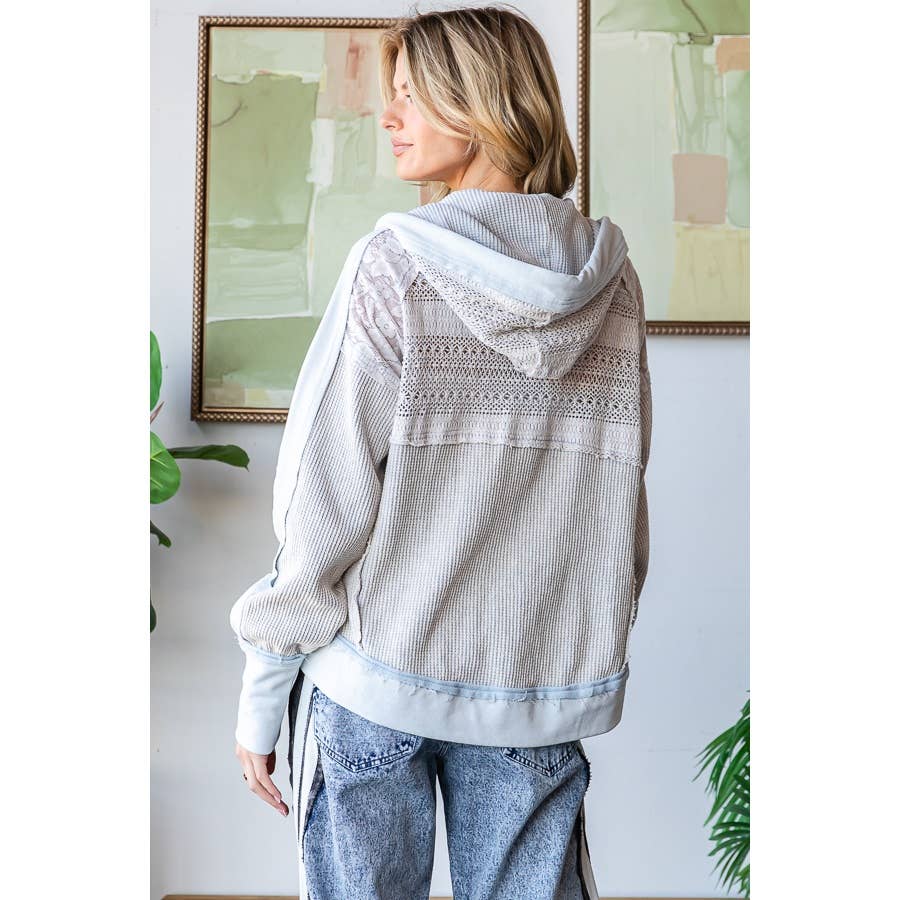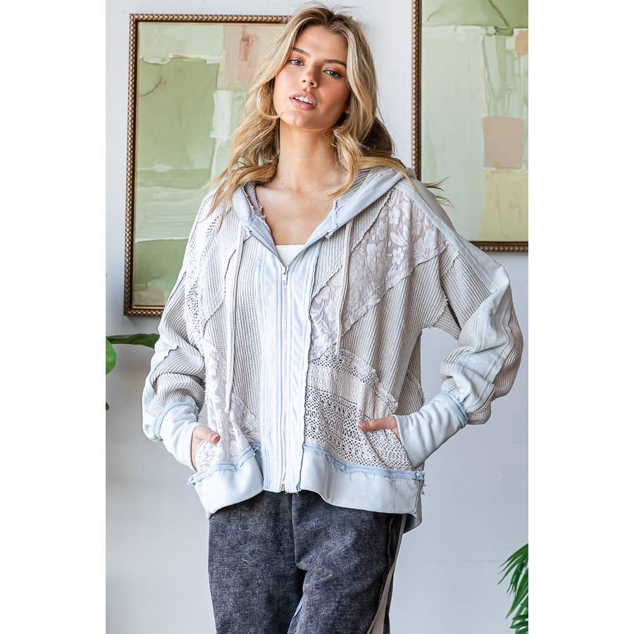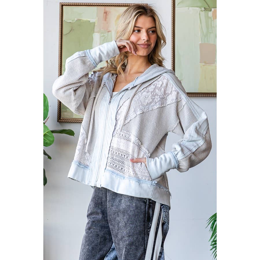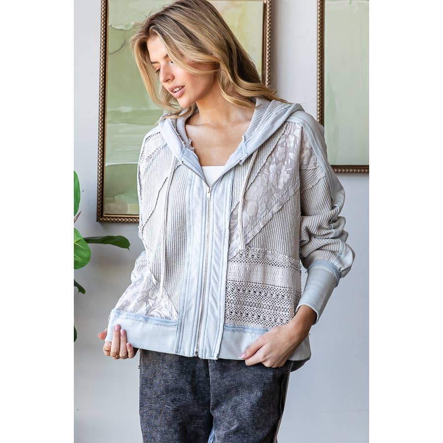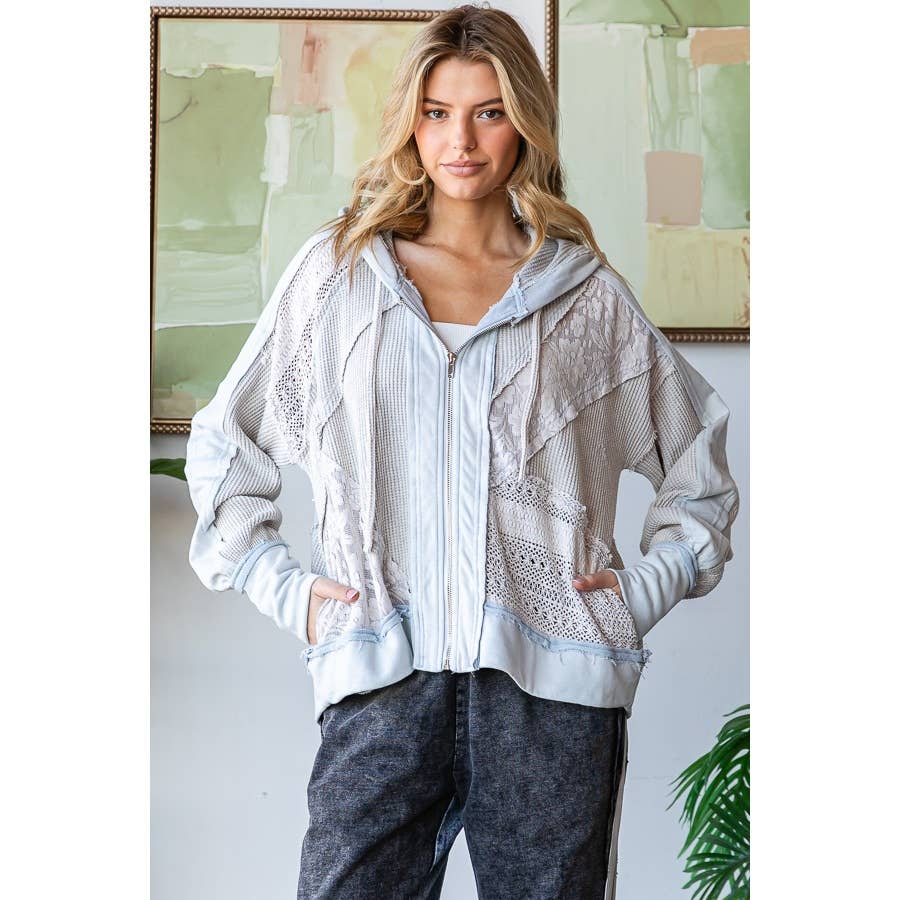 Get cozy with our new Oli And Hali Washed Lace Detail Hooded Jacket! Featuring a unique mineral wash detail, this imported jacket offers a relaxed fit that is true to size. Made with 100% cotton and a blend of cotton and polyester, it's the perfect addition to your wardrobe. (Model wears size "S".)